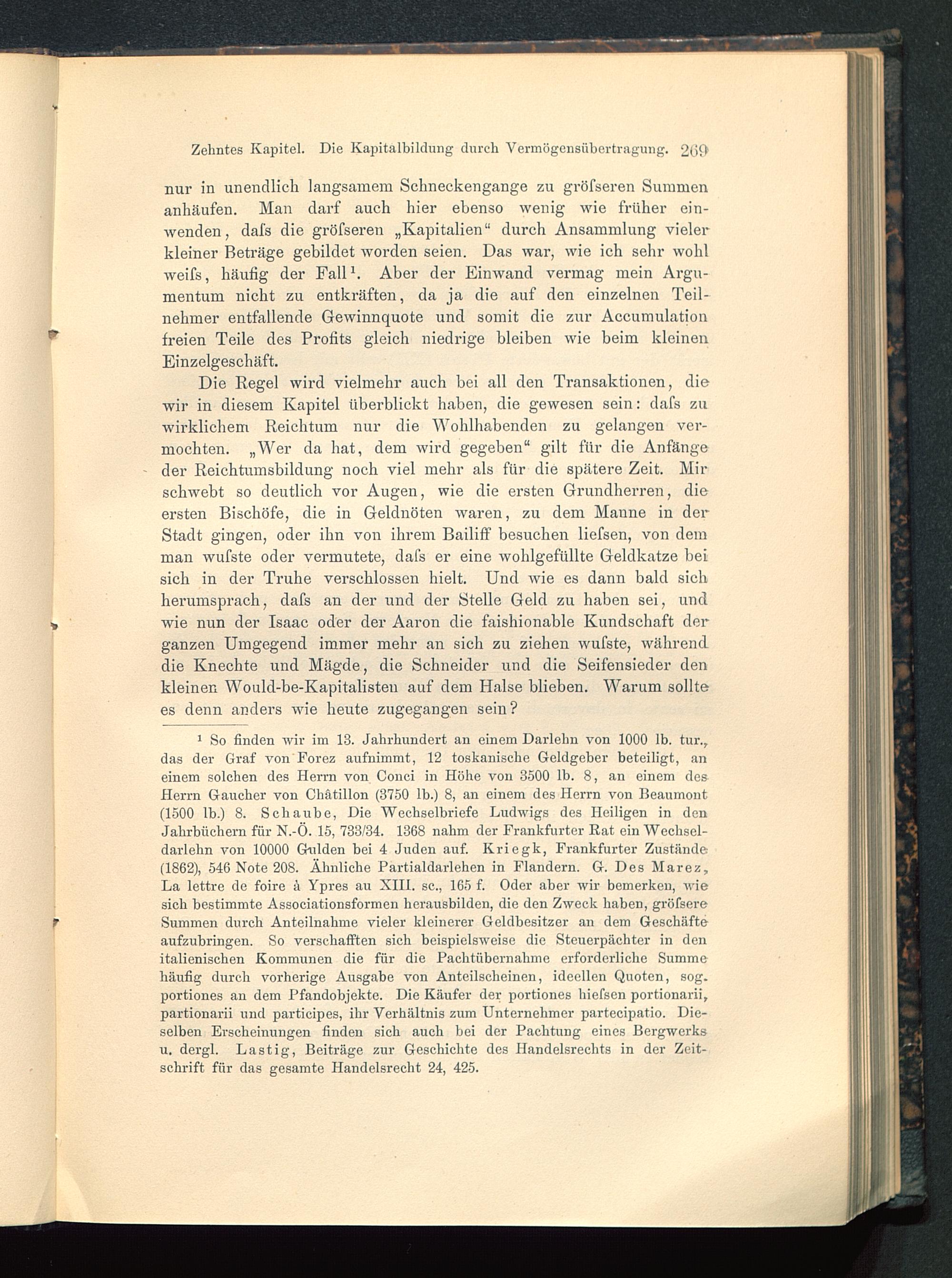 nur in unendlich langsamem Schneckengange zu gröfseren Summenanhäufen. Man darf auch hier ebenso wenig wie früher ein-wenden, dafs die gröfseren „Kapitalien“ durch Ansammlung vielerkleiner Beträge gebildet worden seien. Das war, wie ich sehr wohlweifs, häufig der Fall 1 . Aber der Einwand vermag mein Argu-mentum nicht zu entkräften, da ja die auf den einzelnen Teil-nehmer entfallende Gewinnquote und somit die zur Accumulationfreien Teile des Profits gleich niedrige bleiben wie beim kleinenEinzelgeschäft.