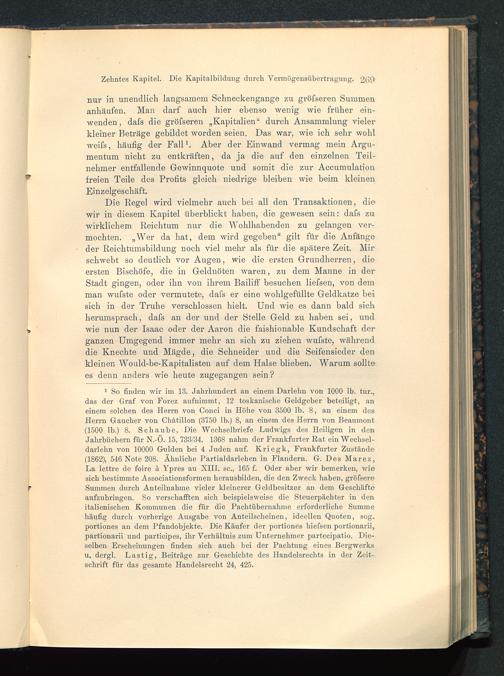 1 So finden wir im 13. Jahrhundert an einem Darlehn von 1000 lb. tur.,das der Graf von Forez aufnimmt, 12 toskanische Geldgeber beteiligt, aneinem solchen des Herrn von Conci in Höhe von 3500 lb. 8, an einem desHerrn Gaucher von Chätillon (3750 lb.) 8, an einem des Herrn von Beaumont(1500 lb.) 8. Schaube, Die Wechselbriefe Ludwigs des Heiligen in denJahrbüchern für N.-Ö. 15, 733/34. 1368 nahm der Frankfurter Rat ein Wechsel-darlehn von 10000 Gulden bei 4 Juden auf. Kriegk, Frankfurter Zustände(1862), 546 Note 208. Ähnliche Partialdarlehen in Flandern. G. Des Marez,La lettre de foire a Ypres au XIII. sc., 165 f. Oder aber wir bemerken, wiesich bestimmte Associationsformen herausbilden, die den Zweck haben, gröfsereSummen durch Anteilnahme vieler kleinerer Geldbesitzer an dem Geschäfteaufzubringen. So verschafften sich beispielsweise die Steuerpächter in denitalienischen Kommunen die für die Pachtübernahme erforderliche Summehäufig durch vorherige Ausgabe von Anteilscheinen, ideellen Quoten, sog.portiones an dem Pfandobjekte. Die Käufer der portiones hiefsen portionarii,partionarii und participes, ihr Verhältnis zum Unternehmer partecipatio. Die-selben Erscheinungen finden sich auch bei der Pachtung eines Bergwerksu. dergl. Lästig, Beiträge zur Geschichte des Handelsrechts in der Zeit-schrift für das gesamte Handelsrecht 24, 425.