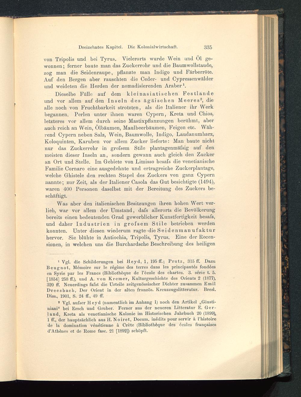 Dieselbe Fülle auf dem kleinasiatischen Festlandeund vor allem auf den Inseln des ägäischen Meeres 2 , diealle noch von Fruchtbarkeit strotzten, als die Italiener ihr Werkbegannen. Perlen unter ihnen waren Cypern, Kreta und Cliios,letzteres vor allem durch seine Mastixpflanzungen berühmt, aberauch reich an Wein, Ölbäumen, Maulbeerbäumen, Feigen etc. Wäh-rend Cypern neben Salz, Wein, Baumwolle, Indigo, Laudanumharz,Koloquinten, Karuben vor allem Zucker lieferte: Man baute nichtnur das Zuckerrohr in grofsem Stile plantagenmäfsig auf denmeisten dieser Inseln an, sondern gewann auch gleich den Zuckeran Ort und Stelle. Im Gebiete von Limisso besafs die venetianischeFamilie Cornaro eine ausgedehnte und ertragreiche Zuckerplantage,welche Ghistele den rechten Stapel des Zuckers von ganz Cypernnannte; zur Zeit, als der Italiener Casola das Gut besichtigte (1494),waren 400 Personen daselbst mit der Bereitung des Zuckers be-schäftigt.