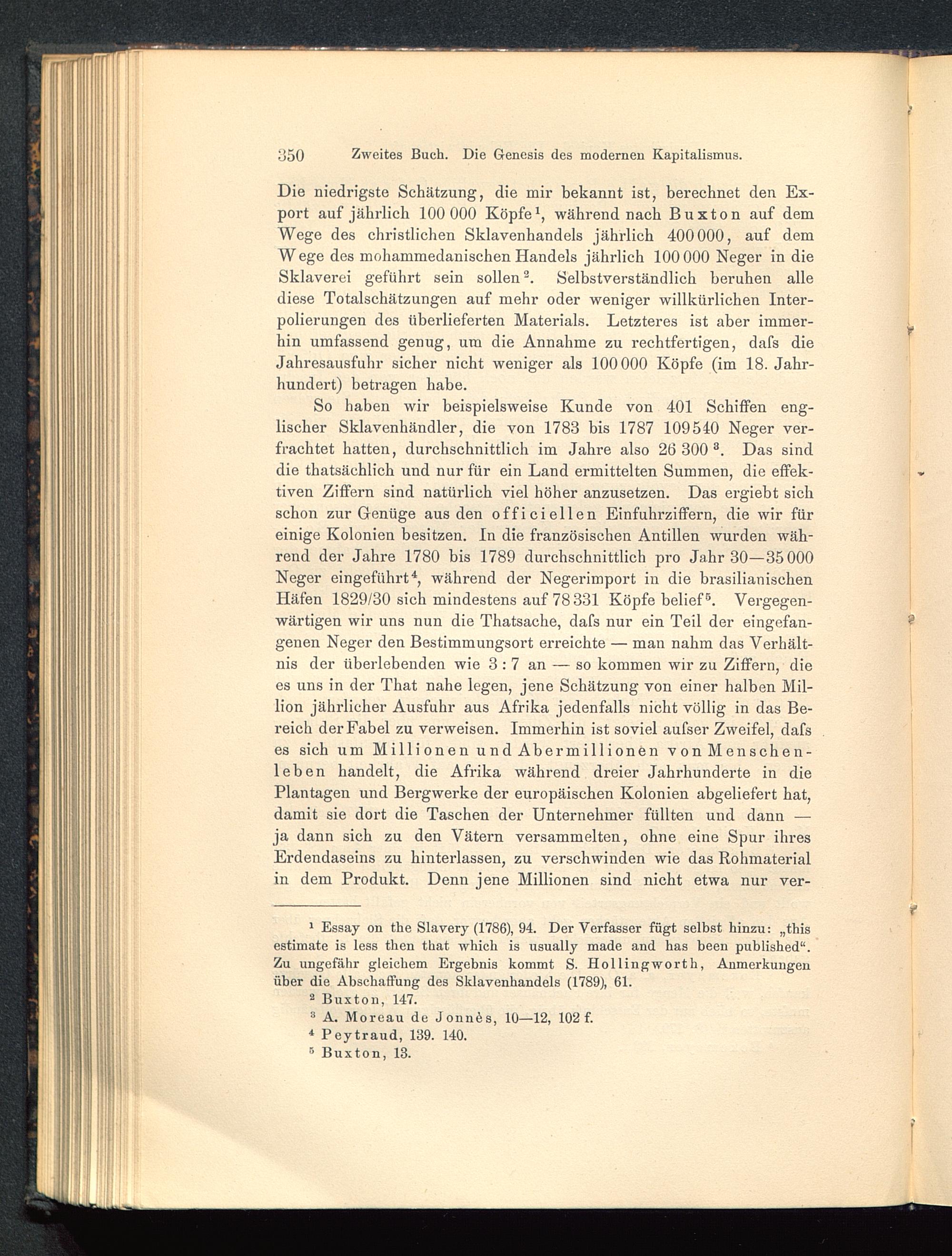 Die niedrigste Schätzung, die mir bekannt ist, berechnet den Ex-port auf jährlich 100 000 Köpfe 1 , während nach Buxton auf demWege des christlichen Sklavenhandels jährlich 400000, auf demW ege des mohammedanischen Handels jährlich 100 000 Neger in dieSklaverei geführt sein sollen 2 * . Selbstverständlich beruhen allediese Totalschätzungen auf mehr oder weniger willkürlichen Inter-polierungen des überlieferten Materials. Letzteres ist aber immer- ^