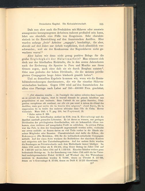 Und zu demselben Ergebnis kommen wir, wenn wir die Renta-bilitätsberechnungen durchmustern, die wir für einzelne Sklaven-wirtschaften besitzen. Gegen 1700 wird auf den französischen An-tillen eine Plantage nach Labat auf 350—400000 Frcs. geschätzt,