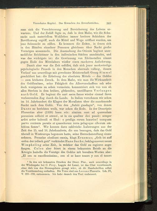 Damit aber war die Zeit erfüllet, dafs sich jener merkwürdigepsychologische Prozefs in den Menschen abermals vollzog, dessenVerlauf uns neuerdings mit gewohnter Meisterschaft Georg Simmel geschildert hat: die Erhebung des absoluten Mittels — des Geldes— zum höchsten Zweck. In dem Mafse, wie man die Wirksamkeitdes Geldbesitzes, seine Fähigkeit des Allesverschaffens sah oderdoch wenigstens zu sehen vermeinte, konzentriert sich von nun aballes Streben in dem heifsen, glühenden, unstillbaren Verlangennach Geld. Es beginnt die auri sacra fames wieder einmal ihrenverheerenden Zug durch die Lande. In Italien vernehmen wir schonim 14. Jahrhundert die Klagen der Moralisten über die zunehmendeSucht nach dem Golde. Von den „Subiti guadagni“, von denenDante zu berichten weifs, war schon die Rede. In der DescriptioFlorentiae aber (1339) lesen wir: nimium sunt ad querendampecuniam solliciti et attenti, ut in eis qualiter dici possit: semperardet ardor habendi et illud: o prodiga rerum luxuries! nunquamparvo contenta paratis et quaesitorum terra pelagoque ciborum am-bitiosa fames 1 . Wir kennen dann zahlreiche Äufserungen aus derZeit des 15. und 16. Jahrhunderts, die uns bezeugen, dafs das Geldüberall in Westeuropa begonnen hatte, seine Herrscherstellung einzu-nehmen. Pecuniae obediunt omnia, klagt Erasmus; „Gelt ist aufferden der irdisch gott “ verkündet Hans Sachs; beklagenswert nenntWimpheling seine Zeit, in welcher das Geld zu regieren ange-fangen. Colon aber feiert in einem bekannten Briefe an dieKönigin Isabella die Vorzüge des Geldes mit beredten Worten also:„El oro es excellentissimo, con el se hace tesoro y con el tesoro
