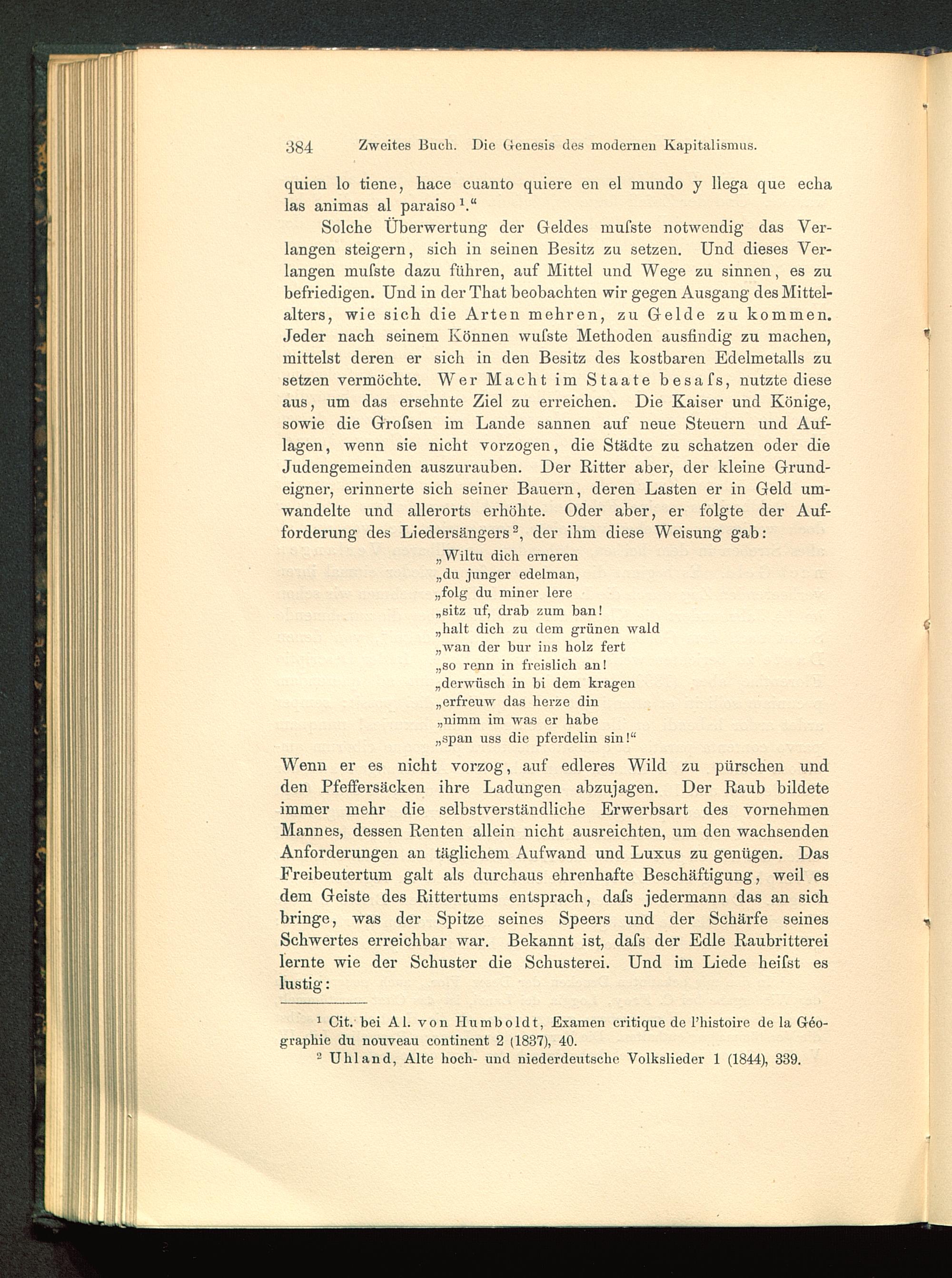 Solche Überwertung der Geldes mufste notwendig das Ver-langen steigern, sich in seinen Besitz zu setzen. Und dieses Ver-langen mufste dazu führen, auf Mittel und Wege zu sinnen, es zubefriedigen. Und in der That beobachten wir gegen Ausgang des Mittel-alters, wie sich die Arten mehren, zu Gelde zu kommen.Jeder nach seinem Können wufste Methoden ausfindig zu machen,mittelst deren er sich in den Besitz des kostbaren Edelmetalls zusetzen vermöchte. Wer Macht im Staate besafs, nutzte dieseaus, um das ersehnte Ziel zu erreichen. Die Kaiser und Könige,sowie die Grofsen im Lande sannen auf neue Steuern und Auf-lagen, wenn sie nicht vorzogen, die Städte zu schätzen oder dieJudengemeinden auszurauben. Der Ritter aber, der kleine Grund-eigner, erinnerte sich seiner Bauern, deren Lasten er in Geld um-wandelte und allerorts erhöhte. Oder aber, er folgte der Auf-forderung des Liedersängers 2 , der ihm diese Weisung gab: