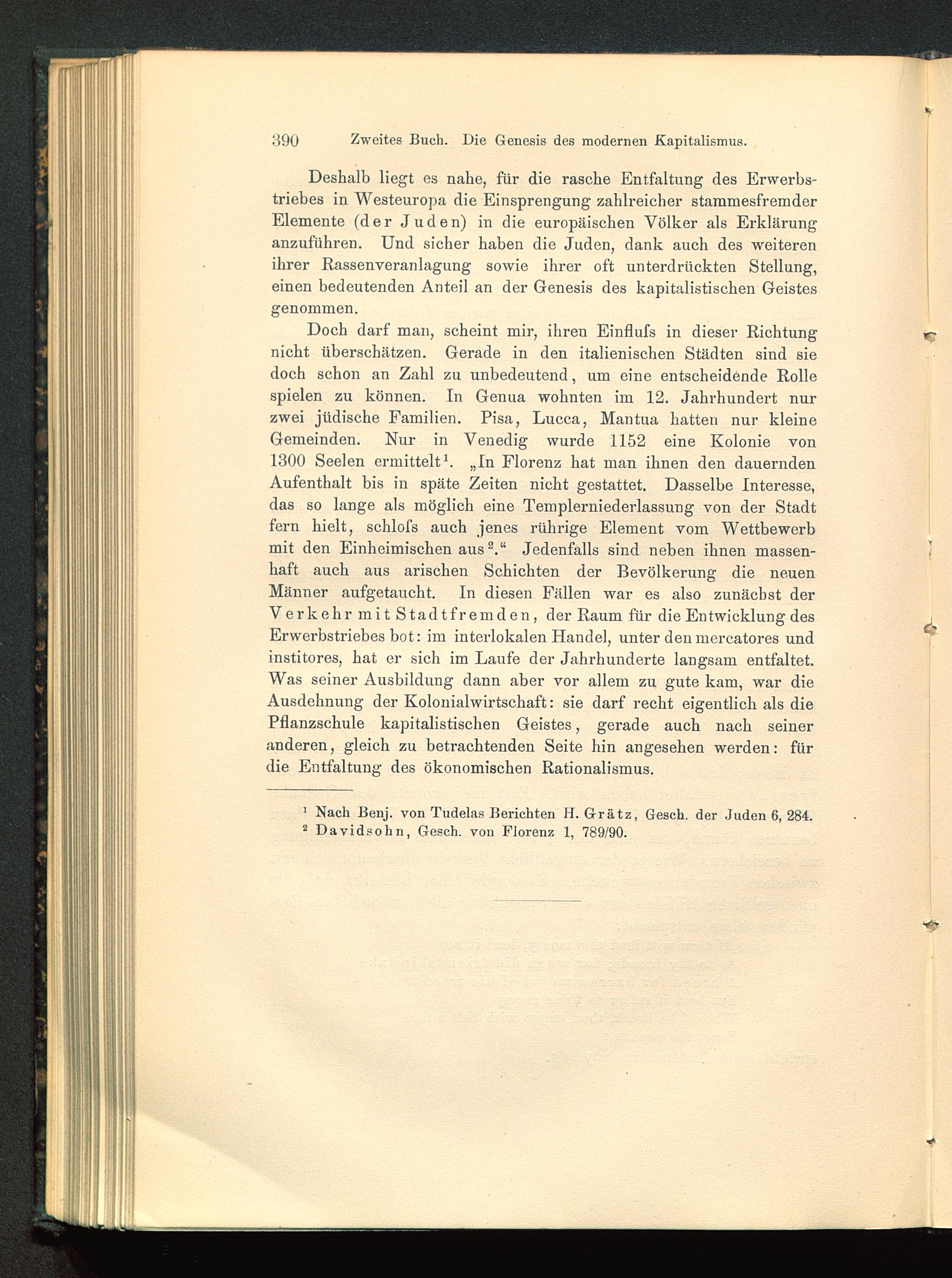 Doch darf man, scheint mir, ihren Einflufs in dieser Richtungnicht überschätzen. Gerade in den italienischen Städten sind siedoch schon an Zahl zu unbedeutend, um eine entscheidende Rollespielen zu können. In Genua wohnten im 12. Jahrhundert nurzwei jüdische Familien. Pisa, Lucca, Mantua hatten nur kleineGemeinden. Nur in Venedig wurde 1152 eine Kolonie von1300 Seelen ermittelt 1 . „In Florenz hat man ihnen den dauerndenAufenthalt bis in späte Zeiten nicht gestattet. Dasselbe Interesse,das so lange als möglich eine Templerniederlassung von der Stadtfern hielt, schlofs auch jenes rührige Element vom Wettbewerbmit den Einheimischen aus 2 .“ Jedenfalls sind neben ihnen massen-haft auch aus arischen Schichten der Bevölkerung die neuenMänner aufgetaucht. In diesen Fällen war es also zunächst derV er kehr mit Stadtfremden, der Raum für die Entwicklung desErwerbstriebes bot: im interlokalen Handel, unter denmercatores undinstitores, hat er sich im Laufe der Jahrhunderte langsam entfaltet.Was seiner Ausbildung dann aber vor allem zu gute kam, war dieAusdehnung der Kolonialwirtschaft: sie darf recht eigentlich als diePflanzschule kapitalistischen Geistes, gerade auch nach seineranderen, gleich zu betrachtenden Seite hin angesehen werden: fürdie Entfaltung des ökonomischen Rationalismus.