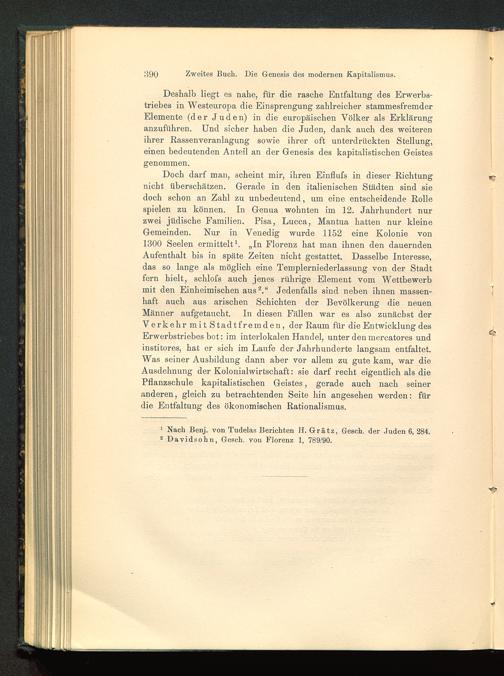 Deshalb liegt es nahe, für die rasche Entfaltung des Erwerbs-triebes in Westeuropa die Einsprengung zahlreicher stammesfremderElemente (der Juden) in die europäischen Völker als Erklärunganzuführen. Und sicher haben die Juden, dank auch des weiterenihrer Rassenveranlagung sowie ihrer oft unterdrückten Stellung,einen bedeutenden Anteil an der Genesis des kapitalistischen Geistesgenommen.