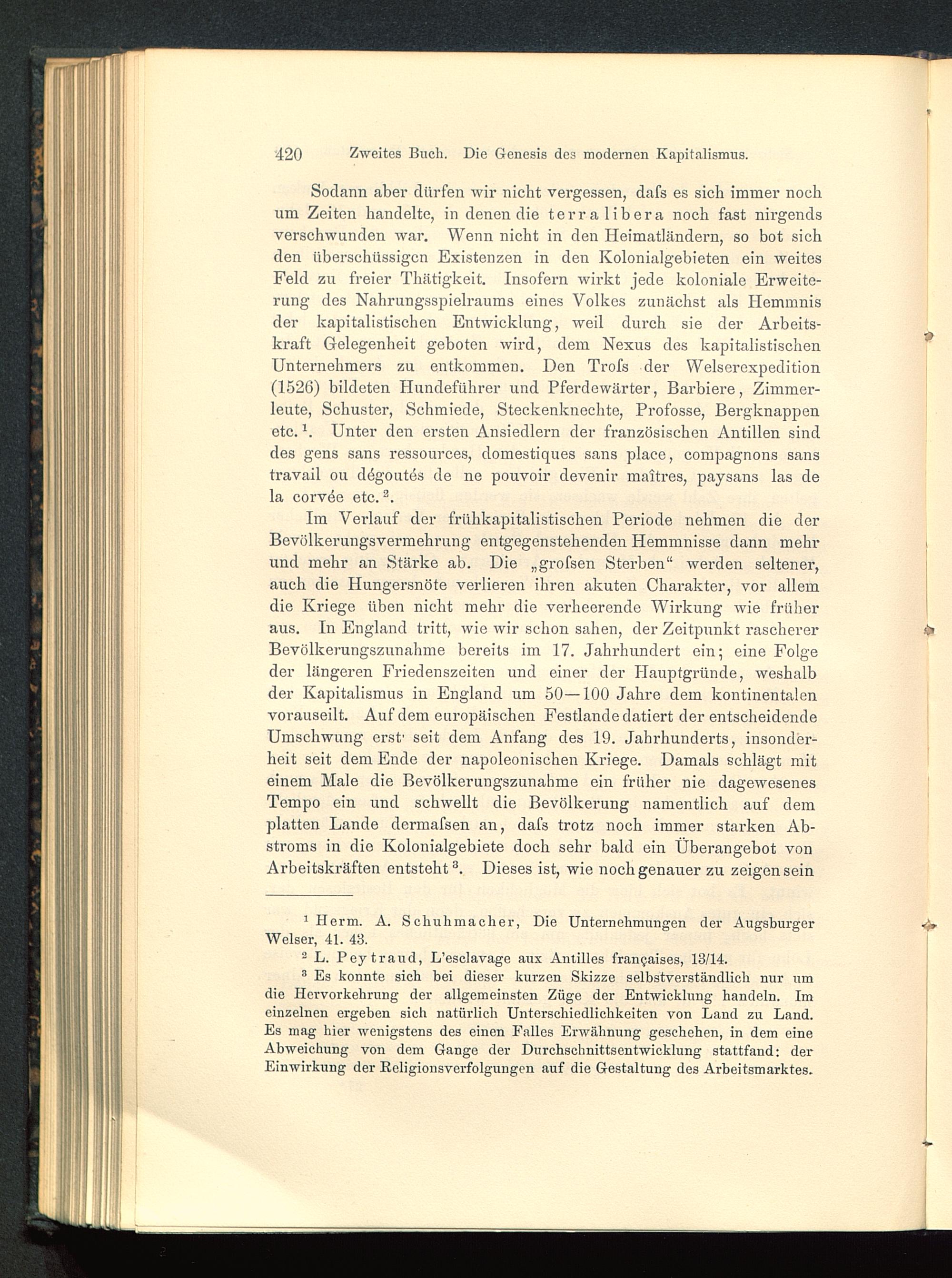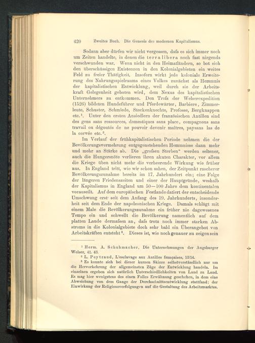 Sodann aber dürfen wir nicht vergessen, dafs es sich immer nochum Zeiten handelte, in denen die terra libera noch fast nirgendsverschwunden war. Wenn nicht in den Heimatländern, so bot sichden überschüssigen Existenzen in den Kolonialgebieten ein weitesFeld zu freier Thätigkeit. Insofern wirkt jede koloniale Erweite-rung des Nahrungsspielraums eines Volkes zunächst als Hemmnisder kapitalistischen Entwicklung, weil durch sie der Arbeits-kraft Gelegenheit geboten wird, dem Nexus des kapitalistischen Unternehmers zu entkommen. Den Trofs der Welsercxpedition(1526) bildeten Hundeführer und Pferdewärter, Barbiere, Zimmer-leute, Schuster, Schmiede, Steckenknechte, Profosse, Bergknappenetc. 1 * . Unter den ersten Ansiedlern der französischen Antillen sinddes gens sans ressources, domestiques sans place, compagnons sanstravail ou dögoutes de ne pouvoir devenir maitres, paysans las dela corvöe etc. 3 .