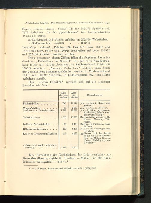 Denn gegenüber obigen Ziffern fallen die folgenden kaum insGewicht: „Fabriken in Metall“ etc. gab es in Norddeutsch-land 15185 mit 121782 Arbeitern, in Süddeutschland 21004 mit155788 Arbeitern. „Andere Fabriken“ endlich, unter denender gesamte Rest zusammengefafst ist, wurden in Norddeutschland13115 mit 100297 Arbeitern, in Süddeutschland 4671 mit 30288Arbeitern gezählt.