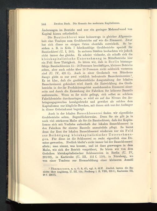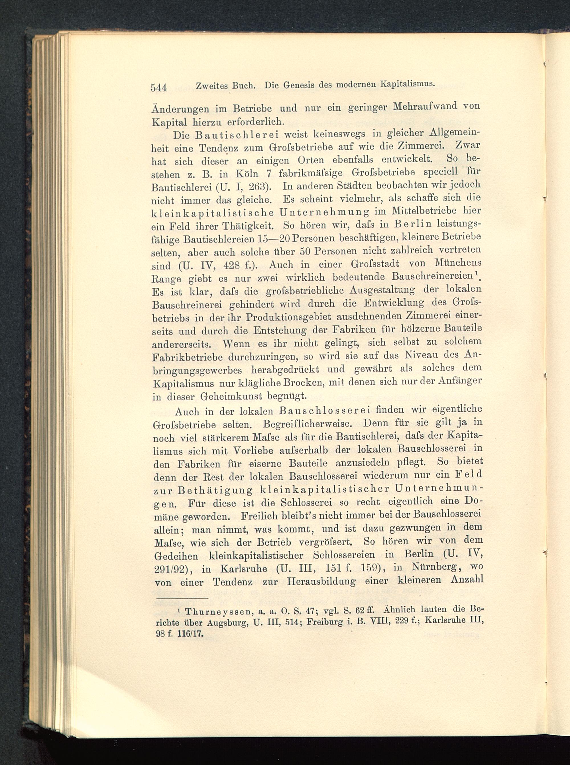 Auch in der lokalen Bauschlosserei finden wir eigentlicheGrofsbetriebe selten. Begreiflicherweise. Denn für sie gilt ja innoch viel stärkerem Mafse als für die Bautischlerei, dafs der Kapita-lismus sich mit Vorliebe aufserhalb der lokalen Bauschlosserei inden Fabriken für eiserne Bauteile anzusiedeln pflegt. So bietetdenn der Rest der lokalen Bauschlosserei wiederum nur ein Feldzur Bethätigung kleinkapitalistischer Unternehmun-gen. Für diese ist die Schlosserei so recht eigentlich eine Do-mäne geworden. Freilich bleibt’s nicht immer bei der Bauschlossereiallein; man nimmt, was kommt, und ist dazu gezwungen in demMafse, wie sich der Betrieb vergröfsert. So hören wir von demGedeihen kleinkapitalistischer Schlossereien in Berlin (U. IV,291/92), in Karlsruhe (U. III, 151 f. 159), in Nürnberg , wovon einer Tendenz zur Herausbildung einer kleineren Anzahl
