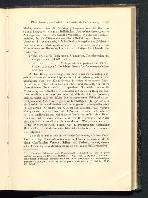 2. Die Eingliederung eines früher handwerksmäfsig aus-geübten Gewerbes in eine kapitalistische Unternehmung setzt immergleichzeitig auch eine Eingliederung in einen vorhandenen Grofs-betrieb voraus; hier ist es also am Platze und statthaft, von einem„kombinierten Grofsbetriebe“ zu sprechen. Sie erfolgt, wenn dieVerbindung der betreffenden Hilfsthätigkeit mit dem Hauptproduk-tionsprozefs eine so enge geworden ist, dafs die örtliche Trennungstörend wirkt oder die Masse der beanspruchten Nebenarbeit ge-nügt, um eine Arbeitskraft ganz zu beschäftigen. Je gröfser alsoein Betrieb, desto zahlreicher und heterogener die eingegliedertenHilfsgewerbe! So finden wir z. B. in den Gufsstahl- etc. WerkenKrupps eine Buchdruckerei mit 11 Pressen und eine Buchbinderei;in der Stollwerkschen Schokoladenfabrik ebenfalls eine Buch-druckerei mit 6 Schnellpressen und eine Buchbinderei. Aber dassind natürlich einstweilen noch Ausnahmen. Was wir vielmehr anhäufig wiederkehrenden Fällen von Eingliederungen ehemaligerHandwerke in kapitalistische Grofsbetriebe beobachten, sind nament-lich folgende:
