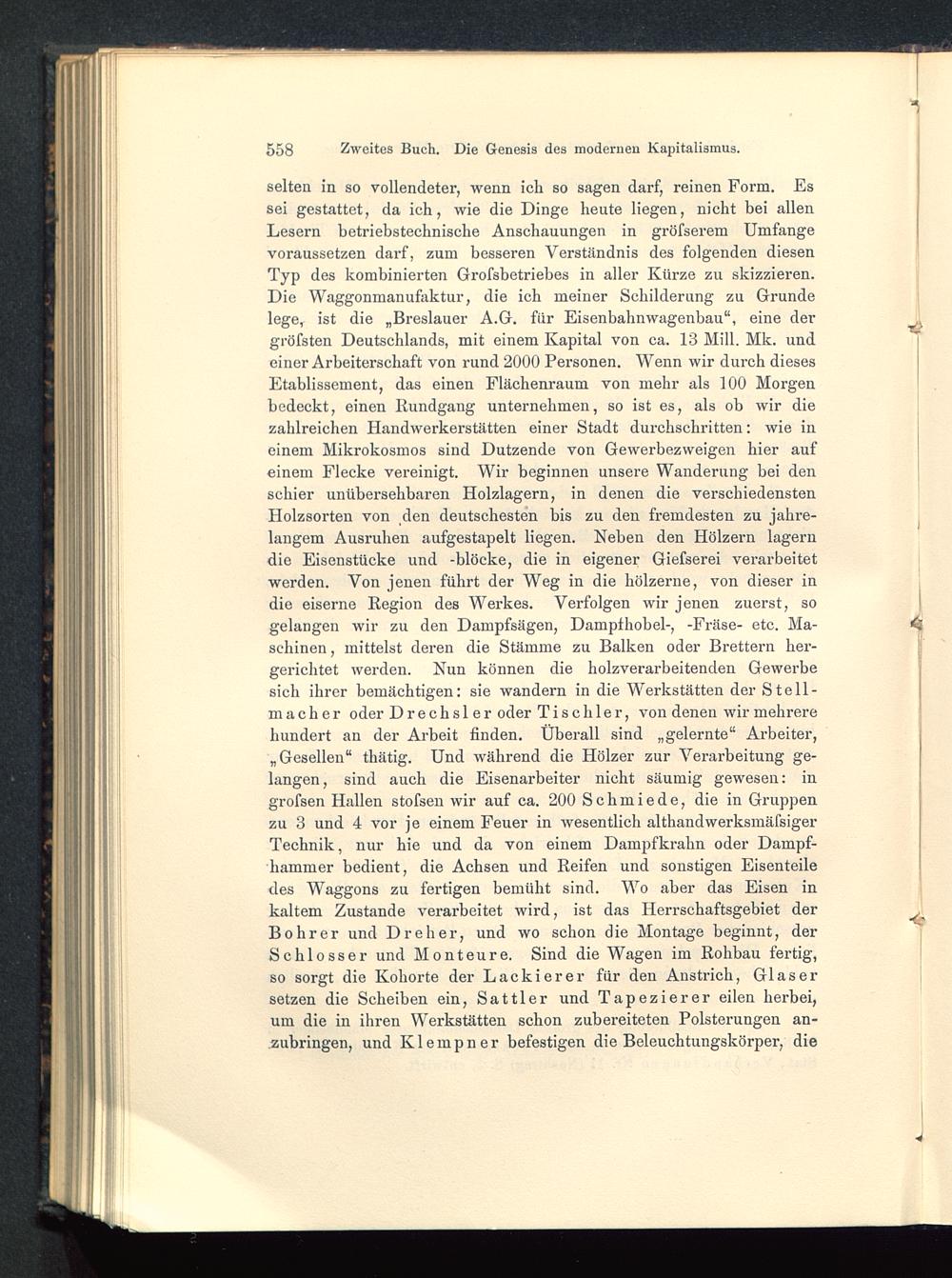 selten in so vollendeter, wenn ich so sagen darf, reinen Form. Essei gestattet, da ich, wie die Dinge heute liegen, nicht bei allenLesern betriebstechnische Anschauungen in gröfserem Umfangevoraussetzen darf, zum besseren Verständnis des folgenden diesenTyp des kombinierten Grofsbetriebes in aller Kürze zu skizzieren.Die Waggonmanufaktur, die ich meiner Schilderung zu Grundelege, ist die „Breslauer A.G. für Eisenbahnwagenbau“, eine dergröfsten Deutschlands , mit einem Kapital von ca. 13 Mill. Mk. undeiner Arbeiterschaft von rund 2000 Personen. Wenn wir durch diesesEtablissement, das einen Flächenraum von mehr als 100 Morgenbedeckt, einen Rundgang unternehmen, so ist es, als ob wir diezahlreichen Handwerkerstätten einer Stadt durchschritten: wie ineinem Mikrokosmos sind Dutzende von Gewerbezweigen hier aufeinem Flecke vereinigt. Wir beginnen unsere Wanderung bei denschier unübersehbaren Holzlagern, in denen die verschiedenstenHolzsorten von den deutschesten bis zu den fremdesten zu jahre-langem Ausruhen aufgestapelt liegen. Neben den Hölzern lagerndie Eisenstücke und -blocke, die in eigener Giefserei verarbeitetwerden. Von jenen führt der Weg in die hölzerne, von dieser indie eiserne Region des Werkes. Verfolgen wir jenen zuerst, sogelangen wir zu den Dampfsägen, Dampthobel-, -Fräse- etc. Ma-schinen, mittelst deren die Stämme zu Balken oder Brettern her-gerichtet werden. Nun können die holzverarbeitenden Gewerbesich ihrer bemächtigen: sie wandern in die Werkstätten der Stell-macher oder Drechsler oder Tischler, von denen wir mehrerehundert an der Arbeit finden. Überall sind „gelernte“ Arbeiter,„Gesellen“ thätig. Und während die Hölzer zur Verarbeitung ge-langen , sind auch die Eisenarbeiter nicht säumig gewesen: ingrofsen Hallen stofsen wir auf ca. 200 Schmiede, die in Gruppenzu 3 und 4 vor je einem Feuer in wesentlich althandwerksmäfsigerTechnik, nur hie und da von einem Dampfkrahn oder Dampf-hammer bedient, die Achsen und Reifen und sonstigen Eisenteiledes Waggons zu fertigen bemüht sind. Wo aber das Eisen inkaltem Zustande verarbeitet wird, ist das Herrschaftsgebiet derBohrer und Dreher, und wo schon die Montage beginnt, derSchlosser und Monteure. Sind die Wagen im Rohbau fertig,so sorgt die Kohorte der Lackierer für den Anstrich, Glasersetzen die Scheiben ein, Sattler und Tapezierer eilen herbei,um die in ihren Werkstätten schon zubereiteten Polsterungen an-.zubringen, und Klempner befestigen die Beleuchtungskörper, die