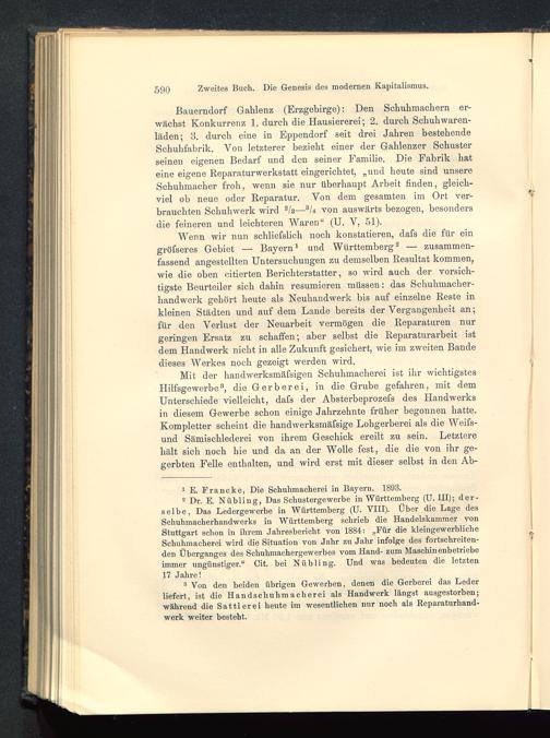 Wenn wir nun schliefslich noch konstatieren, dafs die für eingröfseres Gebiet — Bayern 1 und Württemberg 2 — zusammen-fassend angestellten Untersuchungen zu demselben Resultat kommen,wie die oben citierten Berichterstatter, so wird auch der vorsich-tigste Beurteiler sich dahin resümieren müssen: das Schuhmacher-handwerk gehört heute als Neuhandwerk bis auf einzelne Reste inkleinen Städten und auf dem Lande bereits der Vergangenheit an;für den Verlust der Neuarbeit vermögen die Reparaturen nurgeringen Ersatz zu schaffen; aber selbst die Reparaturarbeit istdem Handwerk nicht in alle Zukunft gesichert, wie im zweiten Bandedieses Werkes noch gezeigt werden wird.