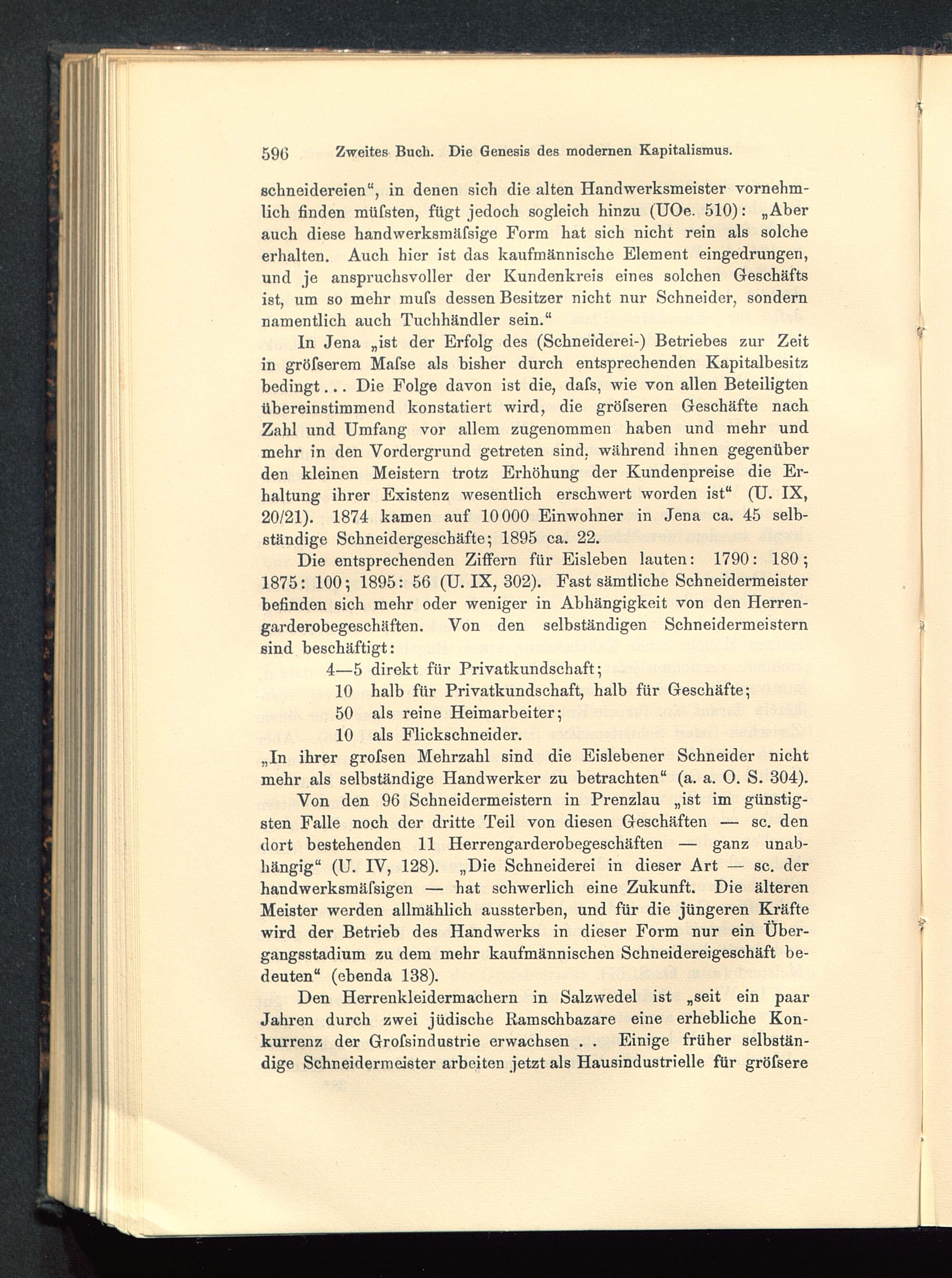 In Jena „ist der Erfolg des (Schneiderei-) Betriebes zur Zeitin gröfserem Mafse als bisher durch entsprechenden Kapitalbesitzbedingt... Die Folge davon ist die, dafs, wie von allen Beteiligtenübereinstimmend konstatiert wird, die gröfseren Geschäfte nachZahl und Umfang vor allem zugenommen haben und mehr undmehr in den Vordergrund getreten sind, während ihnen gegenüberden kleinen Meistern trotz Erhöhung der Kundenpreise die Er-haltung ihrer Existenz wesentlich erschwert worden ist“ (U. IX,20/21). 1874 kamen auf 10000 Einwohner in Jena ca. 45 selb-ständige Schneidergeschäfte; 1895 ca. 22.