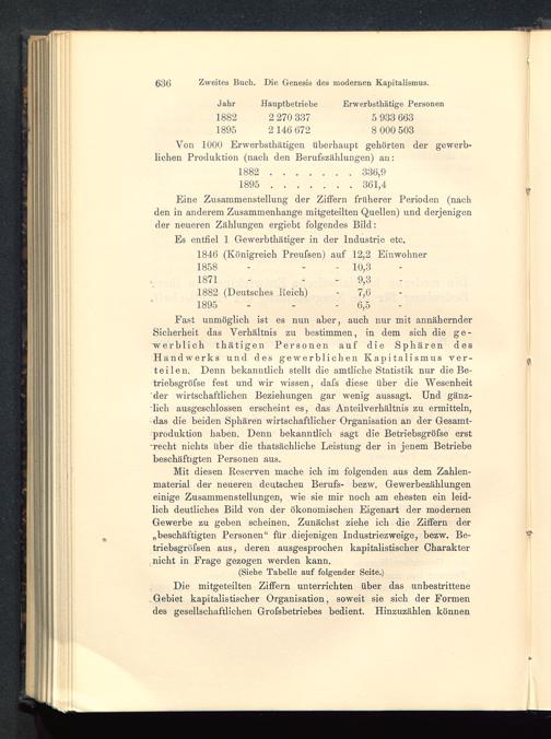 Fast unmöglich ist es nun aber, auch nur mit annähernderSicherheit das Verhältnis zu bestimmen, in dem sich die ge-werblich thätigen Personen auf die Sphären desHand werks und des gewerblichen Kapitalismus ver-teilen. Denn bekanntlich stellt die amtliche Statistik nur die Be-triebsgröfse fest und wir wissen, dafs diese über die Wesenheitder wirtschaftlichen Beziehungen gar wenig aussagt. Und gänz-*lich ausgeschlossen erscheint es, das Anteilverhältnis zu ermitteln,'das die beiden Sphären wirtschaftlicher Organisation an der Gesamt-produktion haben. Denn bekanntlich sagt die Betriebsgröfse erst■recht nichts über die thatsächliche Leistung der in jenem Betriebebeschäftigten Personen aus.