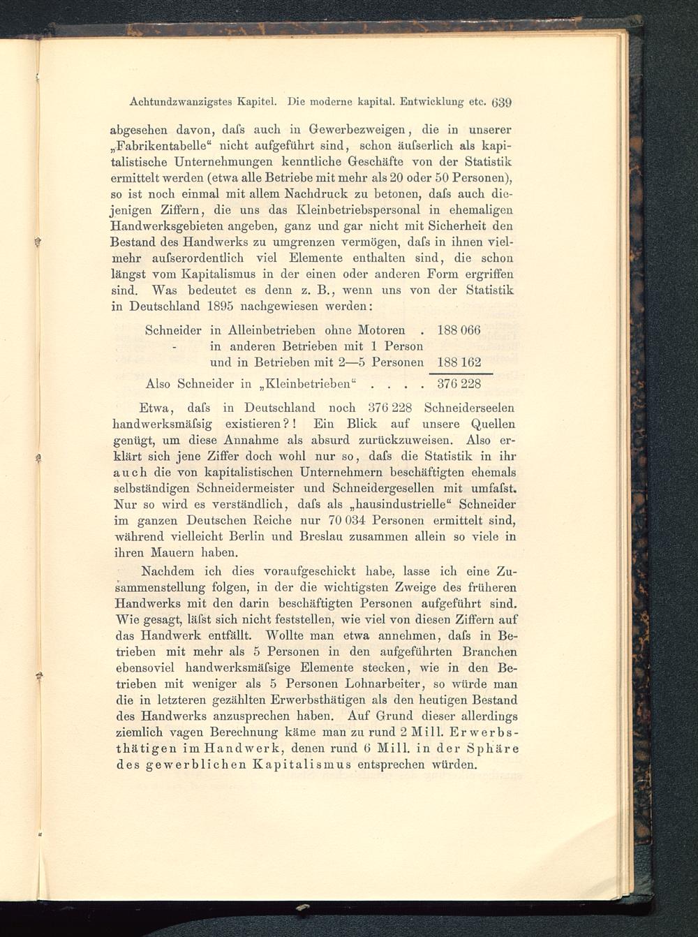 Etwa, dafs in Deutschland noch 376 228 Schneiderseelenhandwerksmäfsig existieren?! Ein Blick auf unsere Quellengenügt, um diese Annahme als absurd zurückzuweisen. Also er-klärt sich jene Ziffer doch wohl nur so, dafs die Statistik in ihrauch die von kapitalistischen Unternehmern beschäftigten ehemalsselbständigen Schneidermeister und Schneidergesellen mit umfafst.Nur so wird es verständlich, dafs als „hausindustrielle“ Schneiderim ganzen Deutschen Reiche nur 70 034 Personen ermittelt sind,während vielleicht Berlin und Breslau zusammen allein so viele inihren Mauern haben.