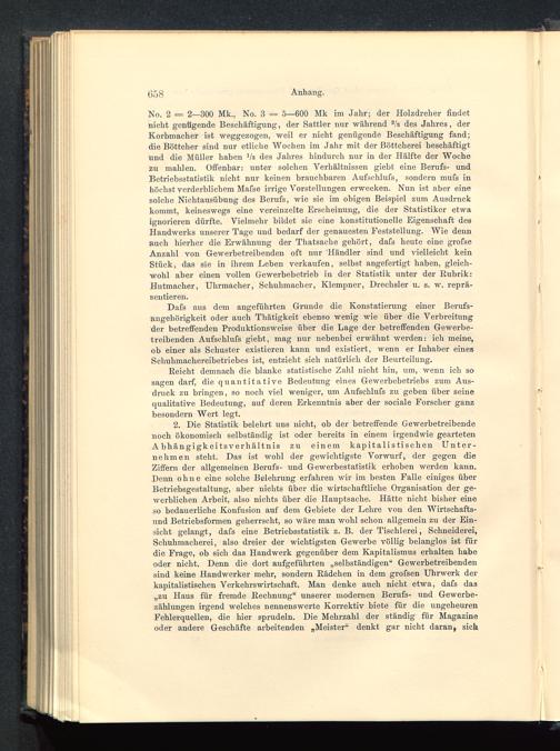 Dafs aus dem angeführten Grunde die Konstatierung einer Berufs-angehörigkeit oder auch Thätigkeit ebenso wenig wie über die Verbreitungder betreffenden Produktionsweise über die Lage der betreffenden Gewerbe-treibenden Aufschlufs giebt, mag nur nebenbei erwähnt werden: ich meine,ob einer als Schuster existieren kann und existiert, wenn er Inhaber einesSchuhmachereibetriebes ist, entzieht sich natürlich der Beurteilung.