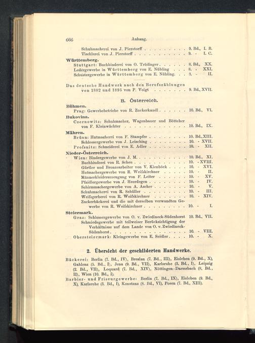 Barbier- und Friseurgewerbe: Berlin (7. Bd., IX), Eisleben (9. Bd.,X), Karlsruhe (3. Bd., I), Konstanz (8. Bd., VI), Posen (7. Bd., XIII).