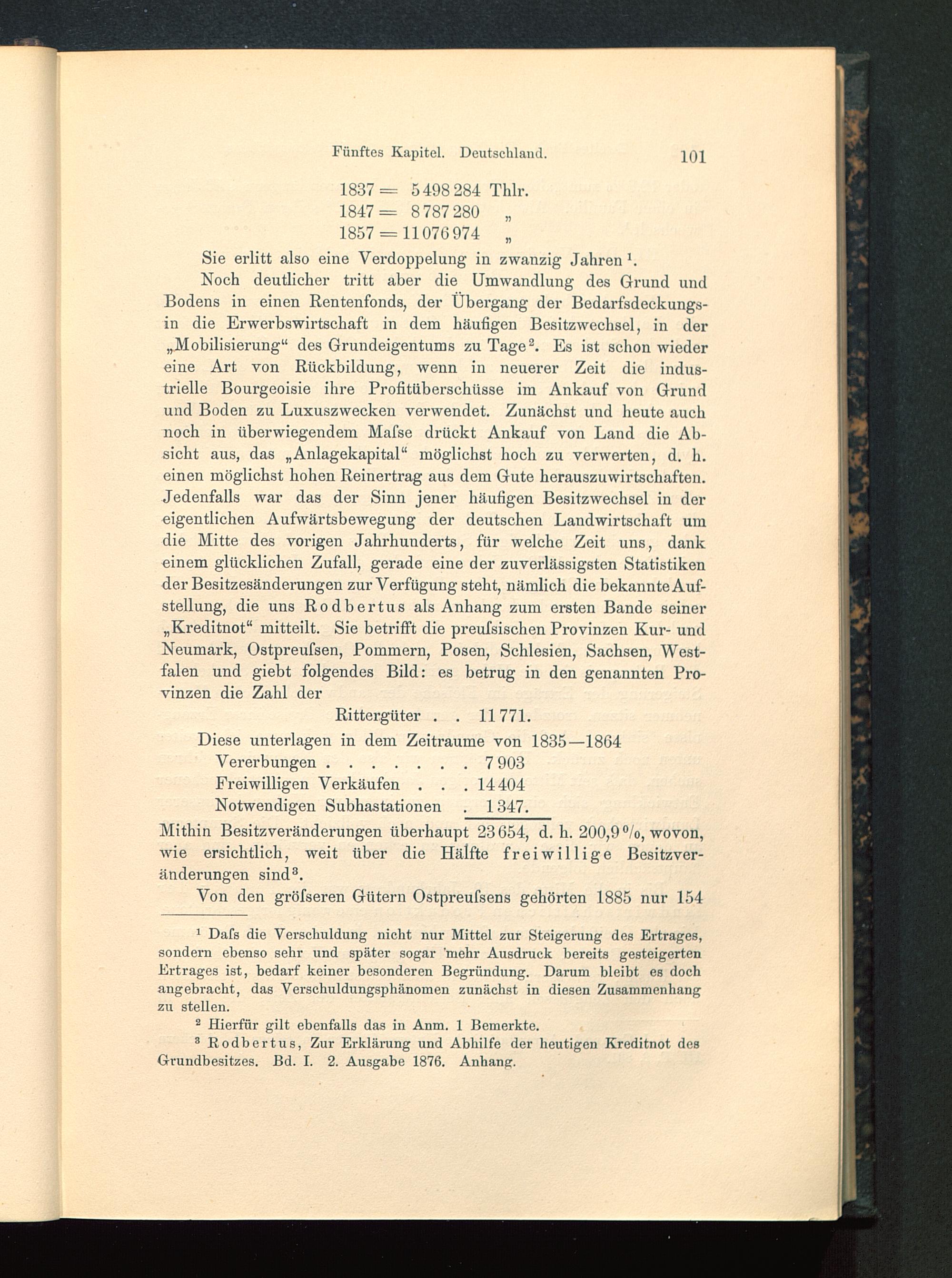 Noch deutlicher tritt aber die Umwandlung des Grund undBodens in einen Rentenfonds, der Übergang der Bedarfsdeckungs-in die Erwerbswirtschaft in dem häufigen Besitzwechsel, in der„Mobilisierung“ des Grundeigentums zu Tage 1 2 . Es ist schon wiedereine Art von Rückbildung, wenn in neuerer Zeit die indus-trielle Bourgeoisie ihre Profitüberschüsse im Ankauf von Grundund Boden zu Luxuszwecken verwendet. Zunächst und heute auchnoch in überwiegendem Mafse drückt Ankauf von Land die Ab-sicht aus, das „Anlagekapital“ möglichst hoch zu verwerten, d. h.einen möglichst hohen Reinertrag aus dem Gute herauszuwirtschaften.Jedenfalls war das der Sinn jener häufigen Besitzwechsel in dereigentlichen Aufwärtsbewegung der deutschen Landwirtschaft umdie Mitte des vorigen Jahrhunderts, für welche Zeit uns, dankeinem glücklichen Zufall, gerade eine der zuverlässigsten Statistikender Besitzesänderungen zur Verfügung steht, nämlich die bekannte Auf-stellung, die uns Rodbertus als Anhang zum ersten Bande seiner„Kreditnot“ mitteilt. Sie betrifft die preufsischen Provinzen Kur- undNeumark, Ostpreufsen, Pommern, Posen, Schlesien, Sachsen, West-falen und giebt folgendes Bild: es betrug in den genannten Pro-vinzen die Zahl der