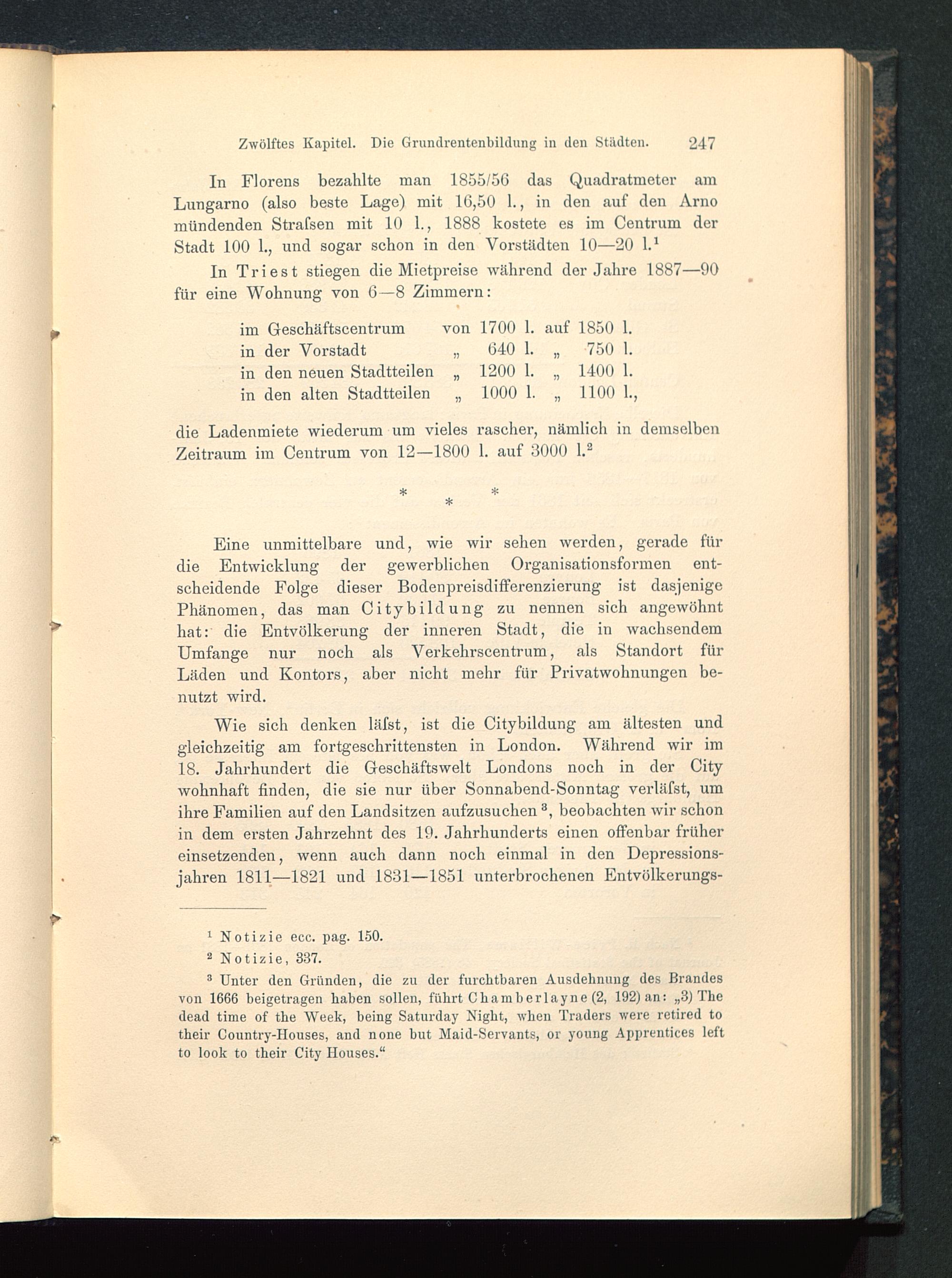 In Florens bezahlte man 1855/56 das Quadratmeter amLungarno (also beste Lage) mit 16,50 1., in den auf den Arnomündenden Strafsen mit 10 1., 1888 kostete es im Centrum derStadt 100 1., und sogar schon in den Vorstädten 10—20 l. 1