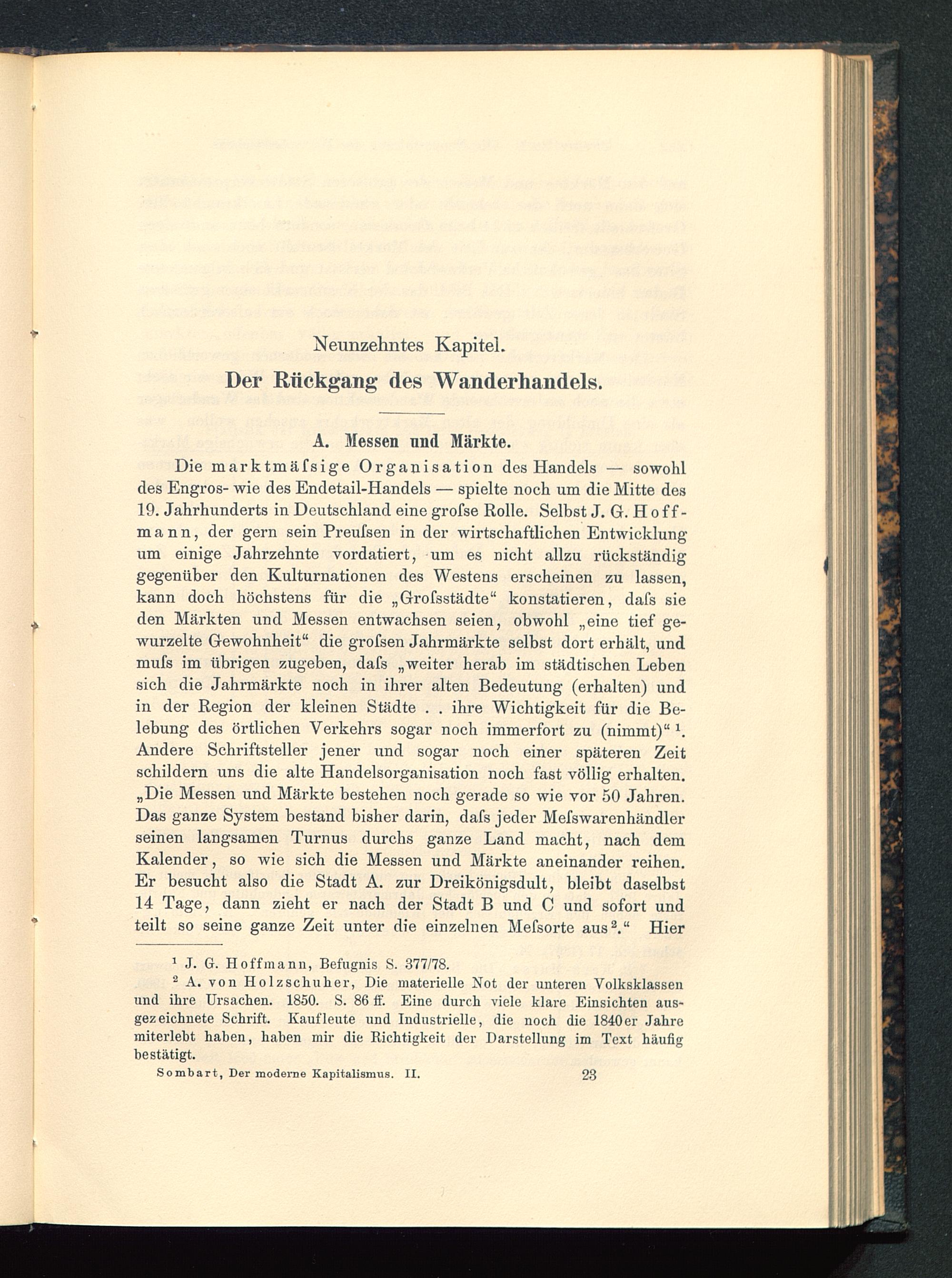 Die marktmäfsige Organisation des Handels — sowohldes Engros- wie des Endetail-Handels — spielte noch um die Mitte des19. Jahrhunderts in Deutschland eine grofse Rolle. Selbst J. G. H off-rn a n n, der gern sein Preufsen in der wirtschaftlichen Entwicklungum einige Jahrzehnte vordatiert, um es nicht allzu rückständiggegenüber den Kulturnationen des Westens erscheinen zu lassen,kann doch höchstens für die „Grofsstädte“ konstatieren, dafs sieden Märkten und Messen entwachsen seien, obwohl „eine tief ge-wurzelte Gewohnheit“ die grofsen Jahrmärkte selbst dort erhält, undmufs im übrigen zugeben, dafs „weiter herab im städtischen Lebensich die Jahrmärkte noch in ihrer alten Bedeutung (erhalten) undin der Region der kleinen Städte . . ihre Wichtigkeit für die Be-lebung des örtlichen Verkehrs sogar noch immerfort zu (nimmt)“ \Andere Schriftsteller jener und sogar noch einer späteren Zeitschildern uns die alte Handelsorganisation noch fast völlig erhalten.„Die Messen und Märkte bestehen noch gerade so wie vor 50 Jahren.Das ganze System bestand bisher darin, dafs jeder Mefswarenhändlerseinen langsamen Turnus durchs ganze Land macht, nach demKalender, so wie sich die Messen und Märkte aneinander reihen.Er besucht also die Stadt A. zur Dreikönigsdult, bleibt daselbst14 Tage, dann zieht er nach der Stadt B und C und sofort undteilt so seine ganze Zeit unter die einzelnen Mefsorte aus 1 2 .“ Hier