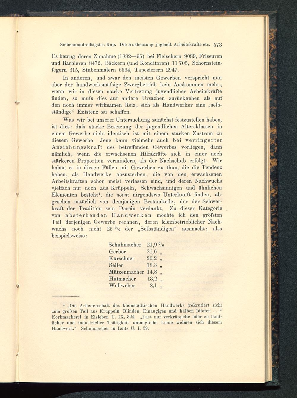 1 „Die Arbeiterschaft des kleinstädtischen Handwerks (rekrutiert sich)zum grofsen Teil aus Krüppeln, Blinden, Einäugigen und halben Idioten .. .“Korbmacherei in Eisleben U. IX, 324. „Fast nur verkrüppelte oder zu länd-licher und industrieller Thätigkeit untaugliche Leute widmen sich diesemHandwerk.“ Schuhmacher in Loitz U. I, 39.