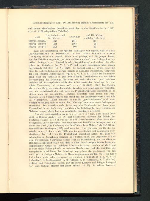 Eine Durchmusterung der Quellen damaliger Zeit ergiebt, dafs sich dasLehrlingsverhältnis in Deutschland in den 1870er Jahren in einemÜbergangsstadium befand. Schon wird geklagt, dafs die jungen Leute,von den Fabriken angelockt, „zu früh verdienen wollen“, statt Lehrgeld zu be-zahlen. Infolge davon: Kontraktbruch, „Verwilderung“ und andere Übel (Er-gebnis der Gutachten des V. f. S. P. und seiner Beratungen über diesenGegenstand: Schriften Bd. XI, 1875). Es beginnt aber als zweite Folge dieSitte des Lehrgeldnehmens gerade damals in Abnahme zu kommen. (Ergebnisder oben citierten Reichsenquete; vgl. a. a. 0. S. 75 ff.) Damit im Zusammen-hang steht das ebenfalls in jene Zeit fallende Verschwinden der häuslichenBeschäftigung des Lehrlings, die mehr und mehr abnimmt, „weil (wie ver-schiedentlich hervorgehoben wird) die Arbeitskraft des Lehrlings für einesolche Verwendung viel zu teuer sei“ (a. a. 0. S. 69 ff.). Blieb dem Meisteralso nichts übrig, als entweder auf die Annahme von Lehrlingen zu verzichten,oder die Arbeitskraft des Lehrlings im Produktionsprozefs entsprechend zunützen, ohne sie auszubilden. Letzteres bedeutete einen Bruch mit Jahr-hunderte alten Überlieferungen und stand mit der Handwerkerehre alten Stilsim Widerspruch. Daher zunächst es nur die „gewissenloseren“ (und meistweniger tüchtigen) Meister waren, die „Lehrlinge“ unter den neuen Bedingungenannahmen. Die fortschreitende Zersetzung des Handwerks hat dann jenenUnterschied in der Auffassung vom Wesen des Lehrlings bei den verschiedenenMeistern ausgeglichen, hat das moralische Empfinden nivelliert.