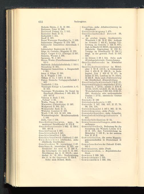 Geschäftssinn I 397.Geschirrarbeit I 547.Geschirrhändler I 625.Geschirrhandwerk (Sattlerei) I 456.Geschlechter (städtische), sieheStädtische Geschlechter.Geschlechter W. (urwüchsige) I 67.Geschmack, bäuerischer II 325; zurGeschichte des mod. G. II 290 ff.;das Geburtsjahr des mod. G. II 306;Nivellierung des G. II 324 ff.; städ-tischer G. II 325; Neuformierungdes G. in der Gegenwart II 324 ff.Siehe auch Bedarf, Mode.