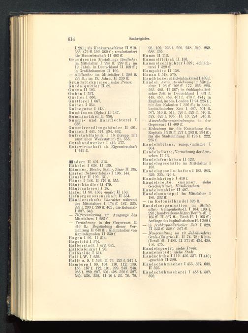 Handbäckerei (Kleinbäckerei)I 488 f.Handel: Arten, Ausdehnung im Mittel-alter I 98 ff. 162 ff. 177. 265. 283.293. 402. II 367; in frühkapitalisti-scher Zeit in Deutschland I 431 f.448. 453. 458. 461 f. 470 f. 474; inEngland, insbes. London II 94. 225 f.;mit den Kolonien I 326 ff.; in hoch-kapitalistischer Zeit I 487. 501 ff.507. 510 ff. 514. 526 f. 529 ff. 540 ff.599. 625 f. 635. II. 13. 224. 346 ff.