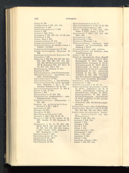 Stadt im ökonomischen Sinne (Begriff)II 191; kapitalistische Stadt II 194 f.;Handelsstadt II 196 ff 222; früh-kapitalistische Grofsstadt II 197 ff.;Konsumtionsstadt II 198 ff 221 ff.;Industriestadt II 205 ff.; primäreIndustriestadt II 213. 417; sekundäreIndustriestadt II 217; industrielleTeilstadt II 215. 222; industrielleYollstadt II 216. 222; Überblicküber die modernen Stadttypen II222f.Siehe auch Großstadt, Kleinstadt.Stadtadel, siehe Patriciat.Stadtpläne I 395.