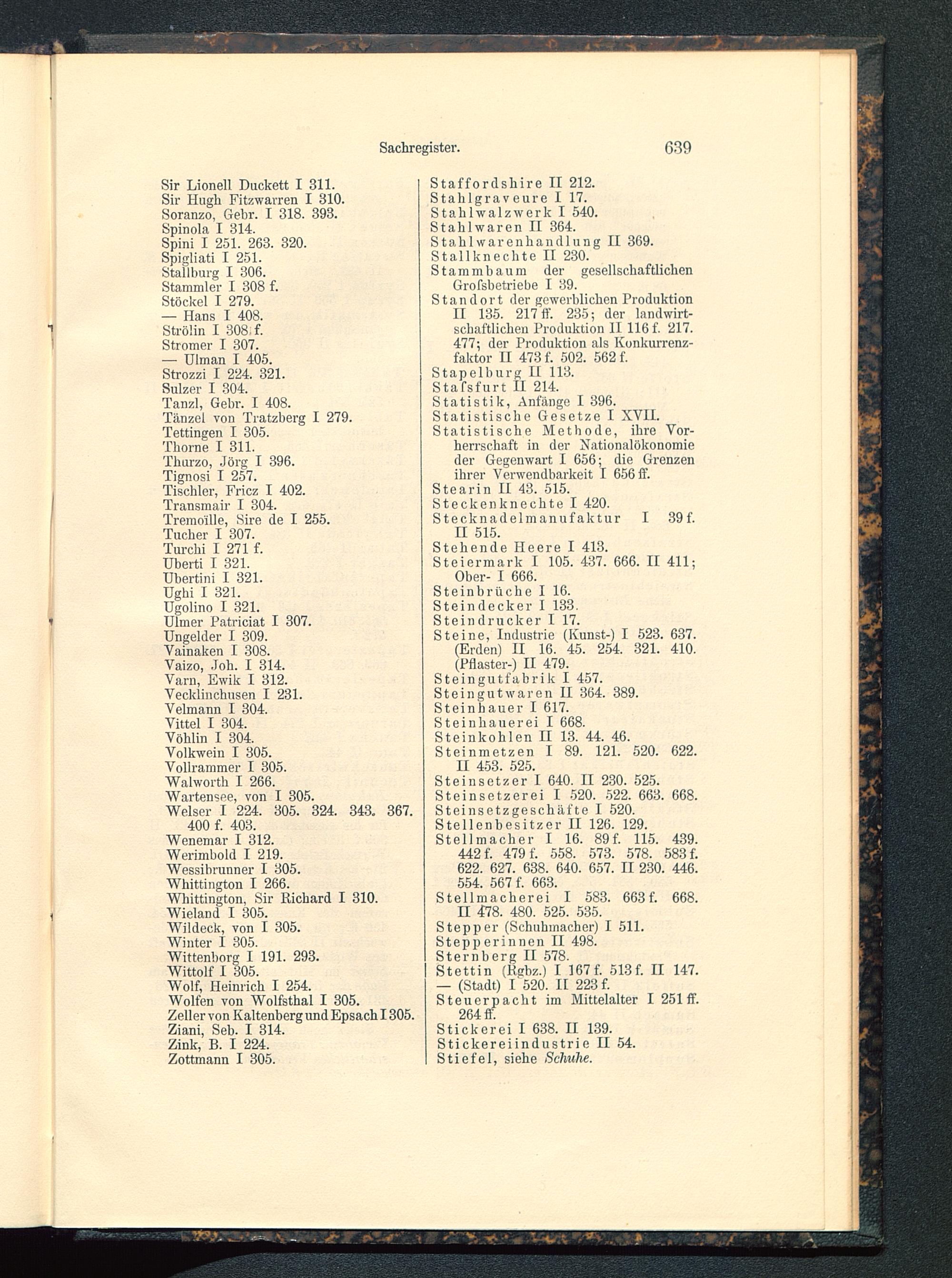 Statistik, Anfänge I 396.Statistische Gesetze I XVII.Statistische Methode, ihre Vor-herrschaft in der Nationalökonomieder Gegenwart I 656; die Grenzenihrer Verwendbarkeit I 656 ff.Stearin II 43. 515.Steckenknechte I 420.Stecknadelmanufaktur I 39f.II 515.