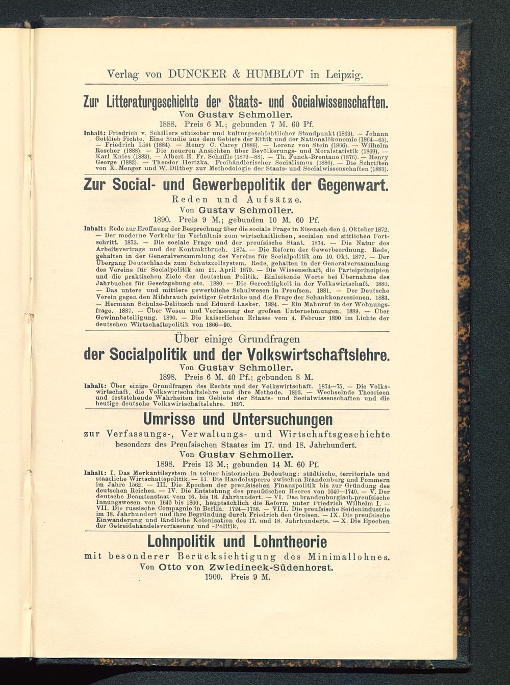 Inhalt: Friedrich v. Schillers ethischer und kulturgeschichtlicher Standpunkt (1863). — Johann. Gottlieb Fichte. Eine Studie aus dem Gebiete der Ethik und der Nationalökonomie (1864—65).— Friedrich List (1884). — Henry C. Carey (1886). — Lorenz von Stein (1866). — WilhelmKoscher (1888). — Die neueren Ansichten über Bevölkerungs- und Moralstatistik (1869). —Karl Knies (1883). — Albert E. Fr. Schäffle (1879—88). — Th. Funck-Brentano (1876). — HenryGeorge (1882). — Theodor Hertzka . Freihändlerischer Socialismus (1886). — Die Schriftenvon K. Menger und W. Dilthey zur Methodologie der Staats- und Socialwissenschaften (1883).