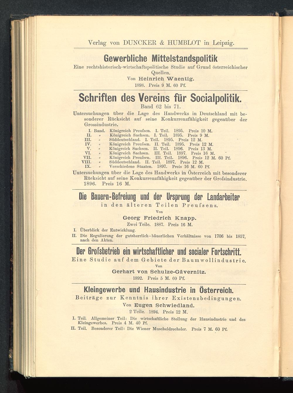 Untersuchungen über die Lage des Handwerks in Österreich mit besondererRücksicht auf seine Konkurrenzfähigkeit gegenüber der Grofsindustrie.1896. Preis 16 M.