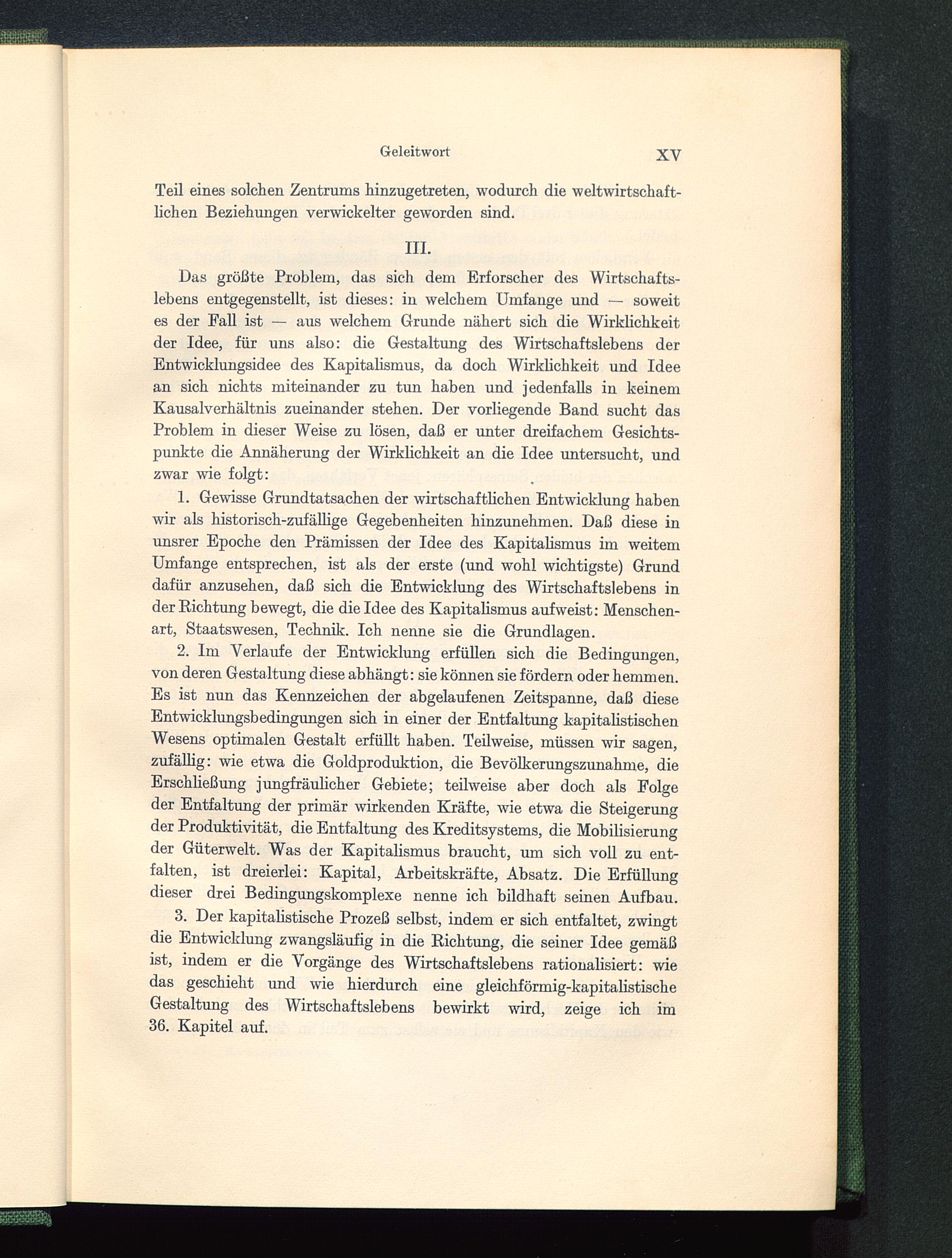 1. Gewisse Grundtatsachen der wirtschaftlichen Entwicklung habenwir als historisch-zufällige Gegebenheiten hinzunehmen. Daß diese inunsrer Epoche den Prämissen der Idee des Kapitalismus im weitemUmfange entsprechen, ist als der erste (und wohl wichtigste) Grunddafür anzusehen, daß sich die Entwicklung des Wirtschaftslebens inder Richtung bewegt, die die Idee des Kapitalismus aufweist: Menschen-art, Staatswesen, Technik. Ich nenne sie die Grundlagen.