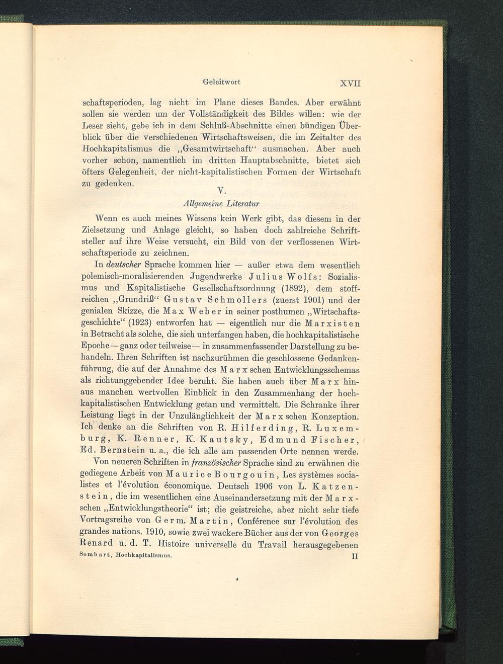 In deutscher Sprache kommen hier — außer etwa dem wesentlichpolemisch-moralisierenden Jugendwerke Julius Wolfs: Sozialis-mus und Kapitalistische Gesellschaftsordnung (1892), dem stoff-reichen „Grundriß“ Gustav Schmollers ( zuerst 1901) und dergenialen Skizze, die Max Weber in seiner posthumen „Wirtschafts-geschichte“ (1923) entworfen hat — eigentlich nur die Marxistenin Betracht als solche, die sich unterfangen haben, die hochkapitalistischeEpoche — ganz oder teilweise— in zusammenfassender Darstellung zu be-handeln. Ihren Schriften ist nachzurühmen die geschlossene Gedanken-führung, die auf der Annahme des Marx sehen Entwicklungsschemasals richtunggebender Idee beruht. Sie haben auch über Marx hin-aus manchen wertvollen Einblick in den Zusammenhang der hoch-kapitalistischen Entwicklung getan und vermittelt. Die Schranke ihrerLeistung liegt in der Unzulänglichkeit der Marx sehen Konzeption.Ich denke an die Schriften von R. Hilferding , R. Luxem-burg, K. Renner , K. Kautsky, Edmund Fischer,Ed. Bernstein u. a., die ich alle am passenden Orte nennen werde.