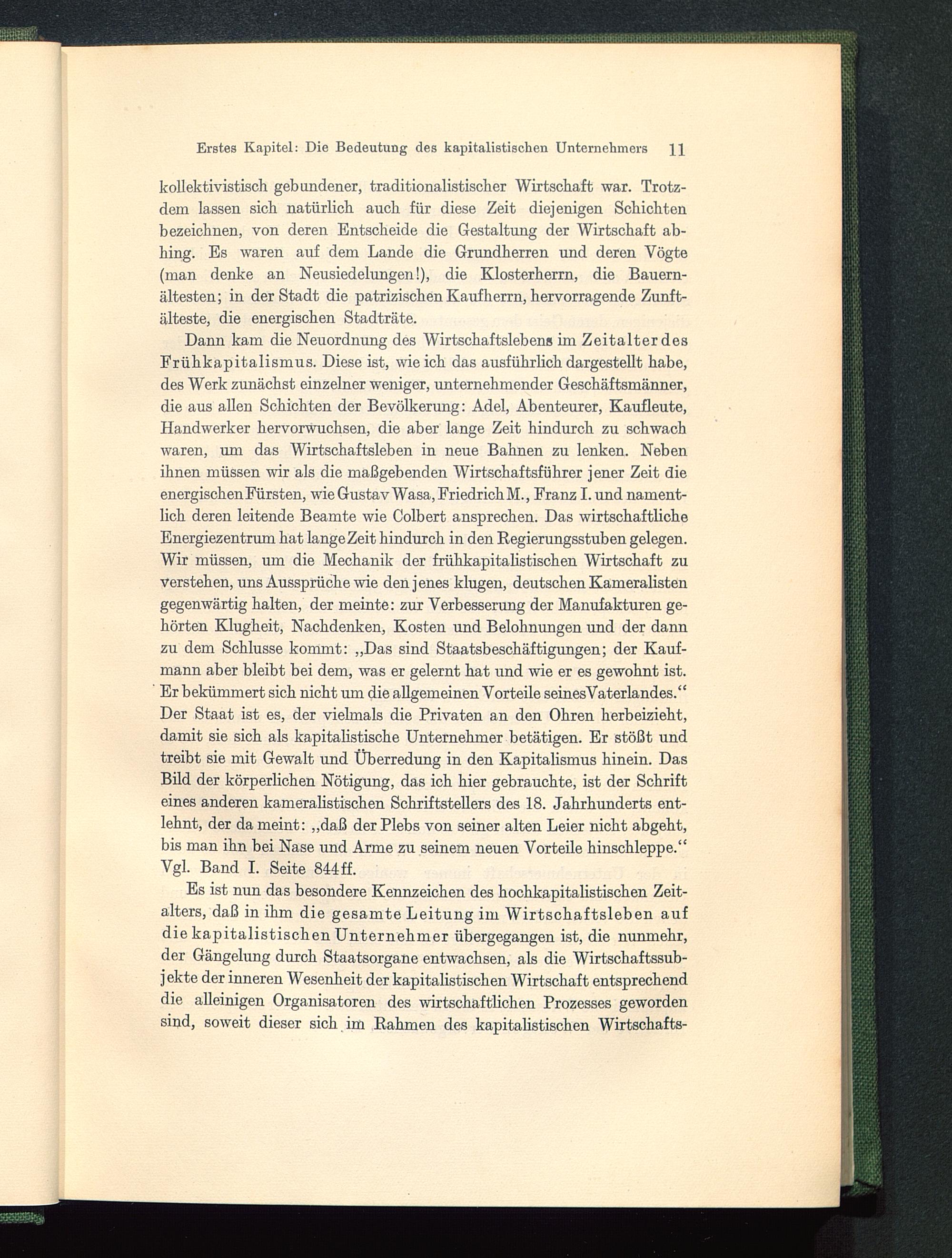 Dann kam die Neuordnung des Wirtschaftslebens im Zeitalter desErühkapitalismus. Diese ist, wie ich das ausführlich dargestellt habe,des Werk zunächst einzelner weniger, unternehmender Geschäftsmänner,die aus allen Schichten der Bevölkerung: Adel, Abenteurer, Kaufleute,Handwerker hervorwuchsen, die aber lange Zeit hindurch zu schwachwaren, um das Wirtschaftsleben in neue Bahnen zu lenken. Nebenihnen müssen wir als die maßgebenden Wirtschaftsführer jener Zeit dieenergischen Fürsten, wie Gustav Wasa, Friedrich M., Franz I. und nament-lich deren leitende Beamte wie Colbert ansprechen. Das wirtschaftlicheEnergiezentrum hat lange Zeit hindurch in den Regierungsstuben gelegen.Wir müssen, um die Mechanik der frühkapitalistischen Wirtschaft zuverstehen, uns Aussprüche wie den jenes klugen, deutschen Kameralistengegenwärtig halten, der meinte: zur Verbesserung der Manufakturen ge-hörten Klugheit, Nachdenken, Kosten und Belohnungen und der dannzu dem Schlüsse kommt: „Das sind Staatsbeschäftigungen; der Kauf-mann aber bleibt bei dem, was er gelernt hat und wie er es gewohnt ist.Er bekümmert sich nicht um die allgemeinen Vorteile seinesVaterlandes.“Der Staat ist es, der vielmals die Privaten an den Ohren herbeizieht,damit sie sich als kapitalistische Unternehmer betätigen. Er stößt undtreibt sie mit Gewalt und Überredung in den Kapitalismus hinein. DasBild der körperlichen Nötigung, das ich hier gebrauchte, ist der Schrifteines anderen kameraüstischen Schriftstellers des 18. Jahrhunderts ent-lehnt, der da meint: „daß der Plebs von seiner alten Leier nicht abgeht,bis man ihn bei Nase und Arme zu seinem neuen Vorteile hinschleppe.“Vgl. Band I. Seite 844 ff.