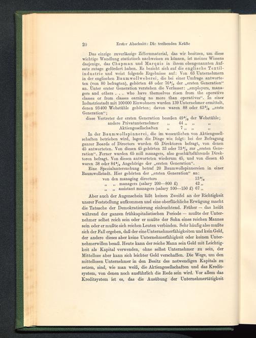 Das einzige zuverlässige Ziffernmaterial, das wir besitzen, um diesewichtige Wandlung statistisch nachweisen zu können, ist meines Wissensdasjenige, das Chapman und Marquis in ihrem obengenannten Auf-satz zutage gefördert haben. Es bezieht sich auf die englische Textil-industrie und weist folgende Ergebnisse auf: Von 63 Unternehmernin der englischen Baumwollweberei, die bei einer Umfrage antworte-ten (von 80 befragten), gehörten 48 oder 76% der „ersten Generation“an. Unter erster Generation verstehen die Verfasser: „employers, mana-gers and others . . . who have themselves risen from the operativeclasses or from classes earning no more than operatives“. In einerIndustriestadt mit 100000 Einwohnern wurden 139 Unternehmer ermittelt,denen 93400 Webstühle gehörten; davon waren 88 oder 63% „ersteGeneration“;