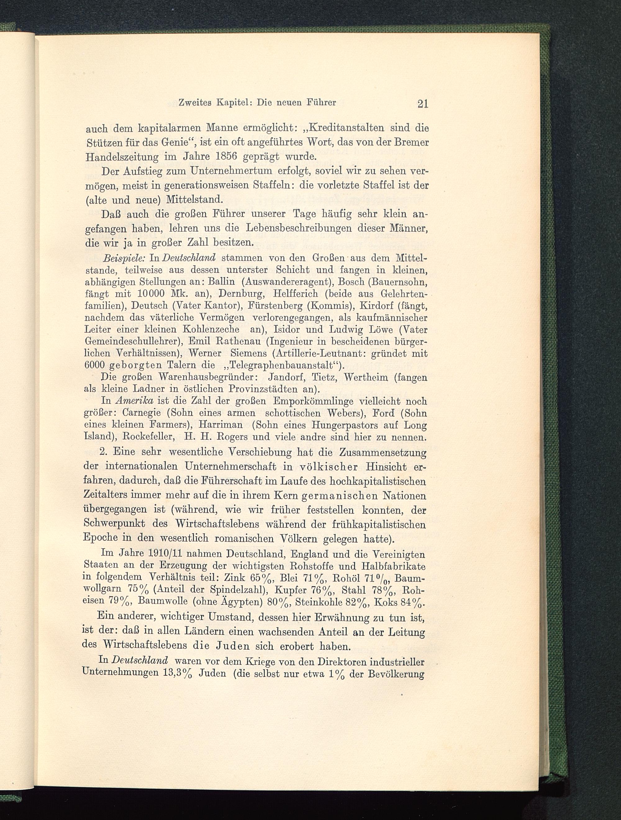 Beispiele: In Deutschland stammen von den Großen aus dem Mittel-stände, teilweise aus dessen unterster Schicht und fangen in kleinen,abhängigen Stellungen an: Ballin (Auswandereragent), Bosch (Bauernsohn,fängt mit 10000 Mk. an), Dernburg, Helfferich (beide aus Gelehrten-familien), Deutsch (Vater Kantor), Fürstenberg (Kommis), Kirdorf (fängt,nachdem das väterliche Vermögen verlorengegangen, als kaufmännischerLeiter einer kleinen Kohlenzeche an), Isidor und Ludwig Löwe (VaterGemeindeschullehrer), Emil Rathenau (Ingenieur in bescheidenen bürger-lichen Verhältnissen), Werner Siemens (Artillerie-Leutnant: gründet mit6000 geborgten Talern die „Telegraphenbauanstalt“).