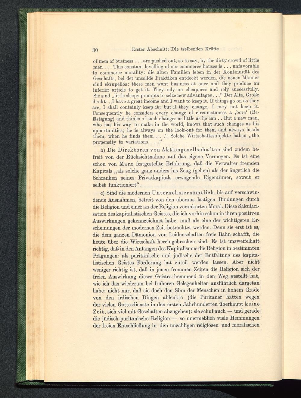 c) Sind die modernen Unternehmer sämtlich, bis auf verschwin-dende Ausnahmen, befreit von den überaus lästigen Bindungen durchdie Religion und einer an der Religion verankerten Moral. Diese Säkulari-sation des kapitalistischen Geistes, die ich vorhin schon in ihren positivenAuswirkungen gekennzeichnet habe, muß als eine der wichtigsten Er-scheinungen der modernen Zeit betrachtet werden. Denn sie erst ist es,die dem ganzen Dämonion von Leidenschaften freie Bahn schafft, dieheute über die Wirtschaft hereingebrochen sind. Es ist unzweifelhaftrichtig, daß in den Anfängen des Kapitalismus die Religion in bestimmtenPrägungen: als puritanische und jüdische der Entfaltung des kapita-listischen Geistes Förderung hat zuteil werden lassen. Aber nichtweniger richtig ist, daß in jenen frommen Zeiten die Religion sich derfreien Auswirkung dieses Geistes hemmend in den Weg gestellt hat,wie ich das wiederum bei früheren Gelegenheiten ausführlich dargetanhabe: nicht nur, daß sie doch den Sinn der Menschen in hohem Gradevon den irdischen Dingen ablenkte (die Puritaner hatten wegender vielen Gottesdienste in den ersten Jahrhunderten überhaupt keineZeit, sich viel mit Geschäften abzugeben): sie schuf auch — und geradedie jüdisch-puritanische Religion — so unermeßlich viele Hemmungender freien Entschließung in den unzähligen religiösen und moralischen