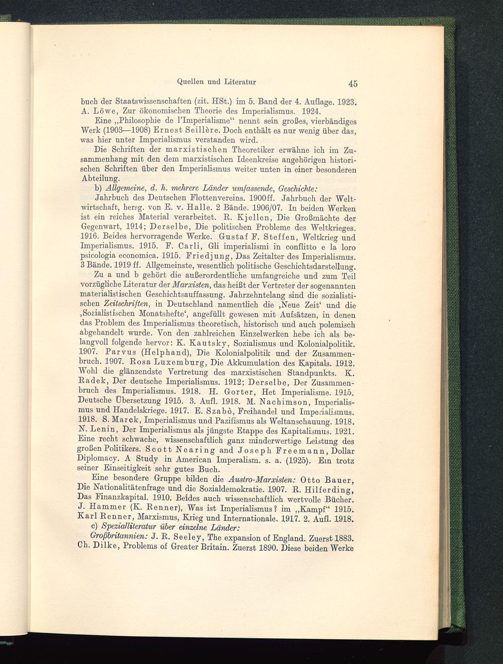 Zu a und b gehört die außerordentliche umfangreiche und zum Teilvorzügliche Literatur der Marxisten, das heißt der Vertreter der sogenanntenmateiialistischen Geschichtsauffassung. Jahrzehntelang sind die sozialisti-schen Zeitschriften, in Deutschland namentlich die ,Neue Zeit 1 und dieSozialistischen Monatshefte 1 , angefüllt gewesen mit Aufsätzen, in denendas Problem des Imperialismus theoretisch, historisch und auch polemischabgehandelt wurde. Von den zahlreichen Einzelwerken hebe ich als be-langvoll folgende hervor: K. Kautsky , Sozialismus und Kolonialpolitik.1907. Parvus (Helphand), Die Kolonialpolitik und der Zusammen-bruch. 1907. Rosa Luxemburg , Die Akkumulation des Kapitals. 1912.Wohl die glänzendste Vertretung des marxistischen Standpunkts. K.Radek, Der deutsche Imperialismus. 1912; Derselbe, Der Zusammen-bruch des Imperialismus. 1918. H. Gorter, Het Imperialisme. 1915.Deutsche Übersetzung 1915. 3. Aufl. 1918. M. Nachimson , Imperialis-mus und Handelskriege. 1917. E. Szabö, Freihandel und Imperialismus.1918. S. Marek, Imperialismus und Pazifismus als Weltanschauung. 1918.N. Lenin, Der Imperialismus als jüngste Etappe des Kapitalismus . 1921.Eine recht schwache, wissenschaftlich ganz minderwertige Leistung desgroßen Politikers. Scott Nearing and Joseph Freemann, DollarDiplomacy. A Study in American Imperalism. s. a. (1925). Ein trotzseiner Einseitigkeit sehr gutes Buch.