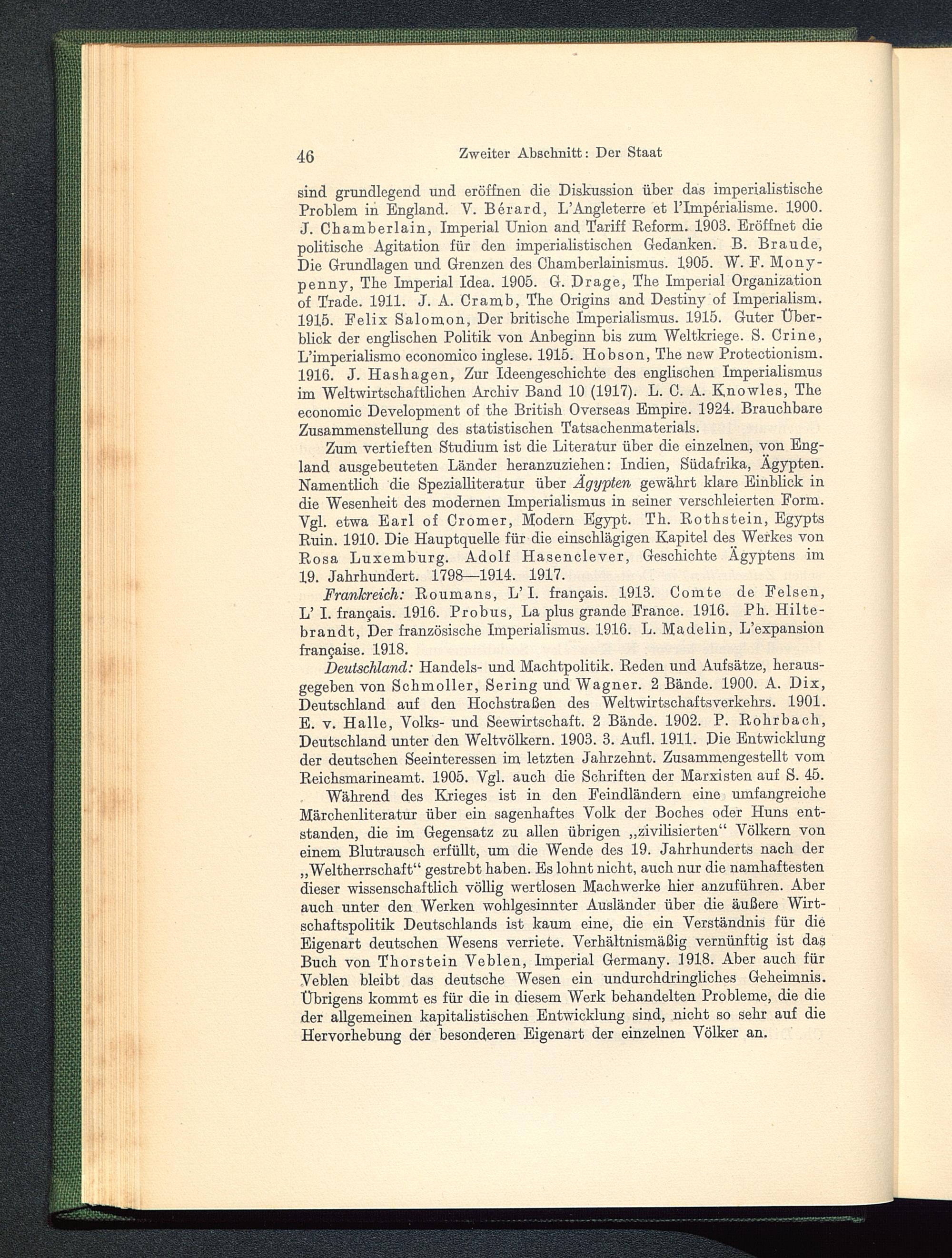Deutschland: Handels- und Machtpolitik. Reden und Aufsätze, heraus-gegeben von Schmoller, Sering und Wagner. 2 Bände. 1900. A. Dix ,Deutschland auf den Hochstraßen des Weltwirtschaftsverkehrs. 1901.E. v. Halle, Volks- und Seewirtschaft. 2 Bände. 1902. P. Rohrbach ,Deutschland unter den Weltvölkern. 1903. 3. Aufl. 1911. Die Entwicklungder deutschen Seeinteressen im letzten Jahrzehnt. Zusammengestellt vomReichsmarineamt. 1905. Vgl. auch die Schriften der Marxisten auf S. 45.
