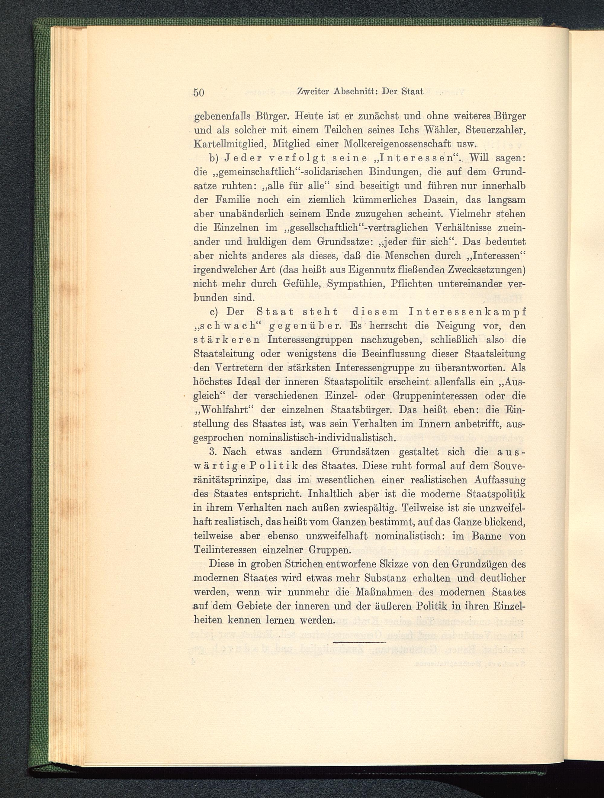 c) Der Staat steht diesem Interessenkampf„schwach“ gegenüber. Es herrscht die Neigung vor, denstärkeren Interessengruppen nachzugeben, schließlich also dieStaatsleitung oder wenigstens die Beeinflussung dieser Staatsleitungden Vertretern der stärksten Interessengruppe zu überantworten. Alshöchstes Ideal der inneren Staatspolitik erscheint allenfalls ein „Aus-gleich“ der verschiedenen Einzel- oder Gruppeninteressen oder die„Wohlfahrt“ der einzelnen Staatsbürger. Das heißt eben: die Ein-stellung des Staates ist, was sein Verhalten im Innern anbetrifft, aus-gesprochen nommalistisch-individualistisch.