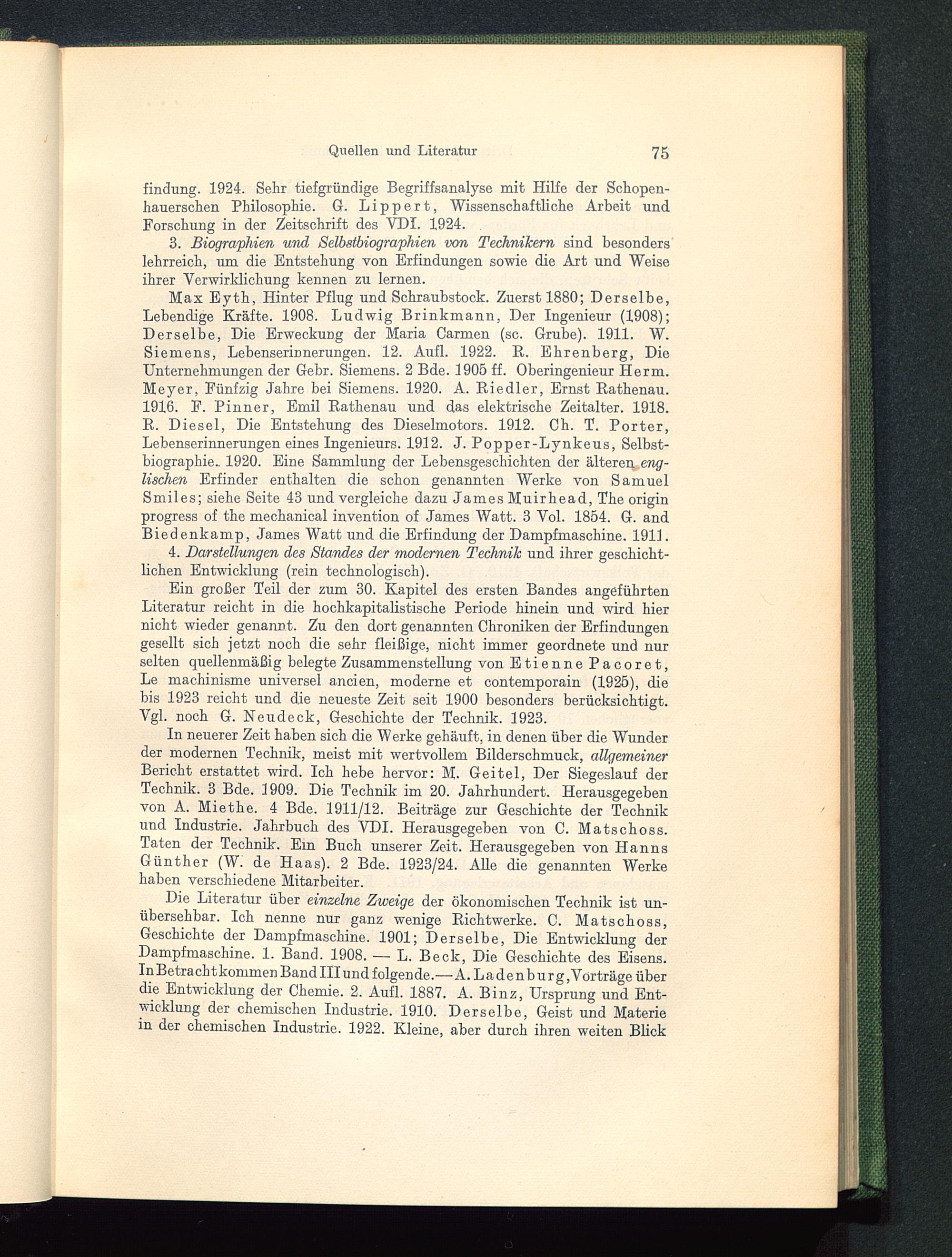 Die Literatur über einzelne Zweige der ökonomischen Technik ist un-übersehbar. Ich nenne nur ganz wenige Richtwerke. C. Matschoss ,Geschichte der Dampfmaschine. 1901; Derselbe, Die Entwicklung derDampfmaschine. 1. Band. 1908. — L. Beck, Die Geschichte des Eisens.In Betracht kommen Band III und folgende.—A. Ladenburg, Vorträge überdie Entwicklung der Chemie. 2. Aufl. 1887. A. Binz, Ursprung und Ent-wicklung der chemischen Industrie. 1910. Derselbe, Geist und Materiein der chemischen Industrie. 1922. Kleine, aber durch ihren weiten Blick