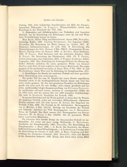 Max Eyth, Hinter Pflug und Schraubstock. Zuerst 1880; Derselbe,Lebendige Kräfte. 1908. Ludwig Brinkmann, Der Ingenieur (1908);Derselbe, Die Erweckung der Maria Carmen (sc. Grube). 1911. W.Siemens, Lebensermnerungen. 12. Aufl. 1922. R. Ehrenberg, DieUnternehmungen der Gebr. Siemens. 2 Bde. 1905 ff. Oberingenieur Herrn.Meyer, Fünfzig Jahre bei Siemens. 1920. A. Riedler , Ernst Rathenau.1916. F. Pinner , Emil Rathenau und das elektrische Zeitalter. 1918.R. Diesel , Die Entstehung des Dieselmotors. 1912. Ch. T. Porter,Lebenserinnerungen eines Ingenieurs. 1912. J. Popper-Lynkeus, Selbst-biographie. 1920. Eine Sammlung der Lebensgeschichten der älteren eng-lischen Erfinder enthalten die schon genannten Werke von SamuelSmiles; siehe Seite 43 und vergleiche dazu James Muirhead, The originprogress of the mechanical invention of James Watt. 3 Vol. 1854. G. andBiedenkamp, James Watt und die Erfindung der Dampfmaschine. 191].