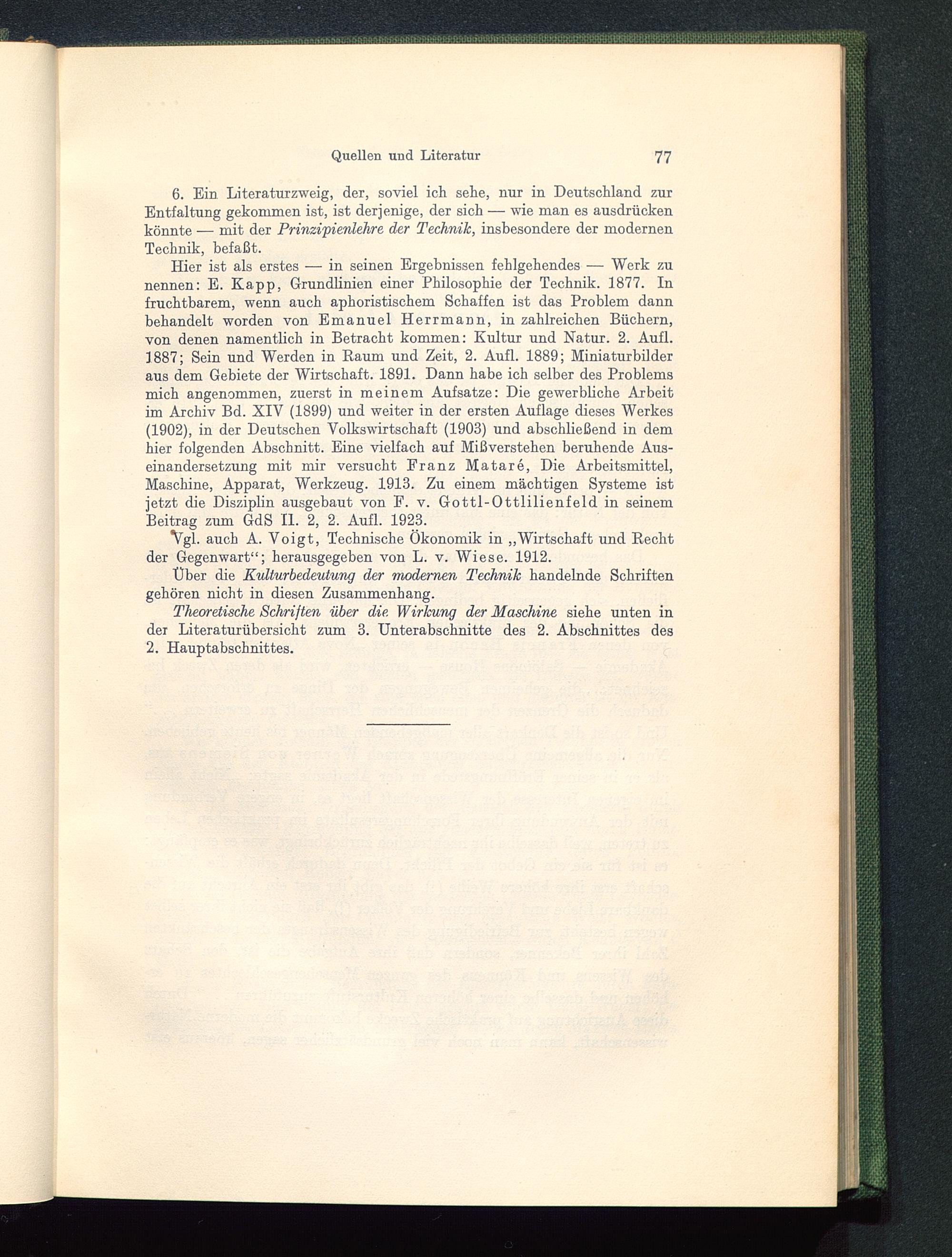 Hier ist als erstes — in seinen Ergebnissen fehlgehendes — Werk zunennen: E. Kapp, Grundlinien einer Philosophie der Technik. 1877. Infruchtbarem, wenn auch aphoristischem Schaffen ist das Problem dannbehandelt worden von Emanuel Herrmann, in zahlreichen Büchern,von denen namentlich in Betracht kommen: Kultur und Natur. 2. Aufl.1887; Sein und Werden in Raum und Zeit, 2. Aufl. 1889; Miniaturbilderaus dem Gebiete der Wirtschaft. 1891. Dann habe ich selber des Problemsmich angenommen, zuerst in meinem Aufsatze: Die gewerbliche Arbeitim Archiv Bd. XIV (1899) und weiter in der ersten Auflage dieses Werkes(1902), in der Deutschen Volkswirtschaft (1903) und abschließend in demhier folgenden Abschnitt. Eine vielfach auf Mißverstehen beruhende Aus-einandersetzung mit mir versucht Eranz Matare, Die Arbeitsmittel,Maschine, Apparat, Werkzeug. 1913. Zu einem mächtigen Systeme istjetzt die Disziplin ausgebaut von F. v. Gottl-Ottlilienfeld in seinemBeitrag zum GdS II. 2, 2. Aufl. 1923.