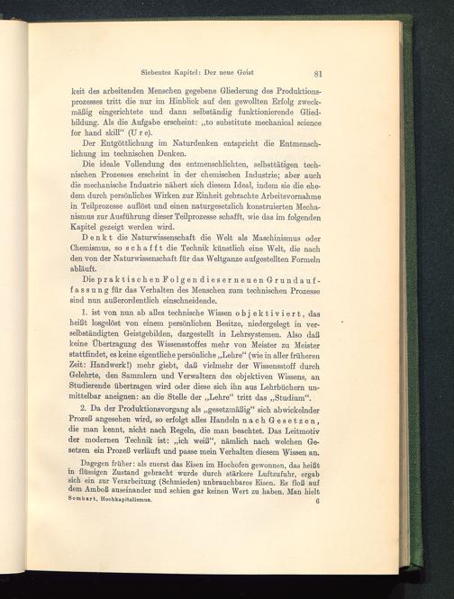 Die ideale Vollendung des entmenschlichten, selbsttätigen tech-nischen Prozesses erscheint in der chemischen Industrie; aber auchdie mechanische Industrie nähert sich diesem Ideal, indem sie die ehe-dem durch persönliches Wirken zur Einheit gebrachte Arbeitsvornahmein Teilprozesse auflöst und einen naturgesetzlich konstruierten Mecha-nismus zur Ausführung dieser Teilprozesse schafft, wie das im folgendenKapitel gezeigt werden wird.