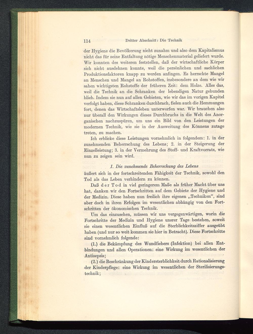 Daß der Tod in viel geringerem Maße als früher Macht über unshat, danken wir den Fortschritten auf dem Gebiete der Hygiene undder Medizin. Diese kaben nun freilich ihre eigenen „Techniken“, sindaber doch in ihren Erfolgen im wesentlichen abhängig von den Fort-schritten der ökonomischen Technik.