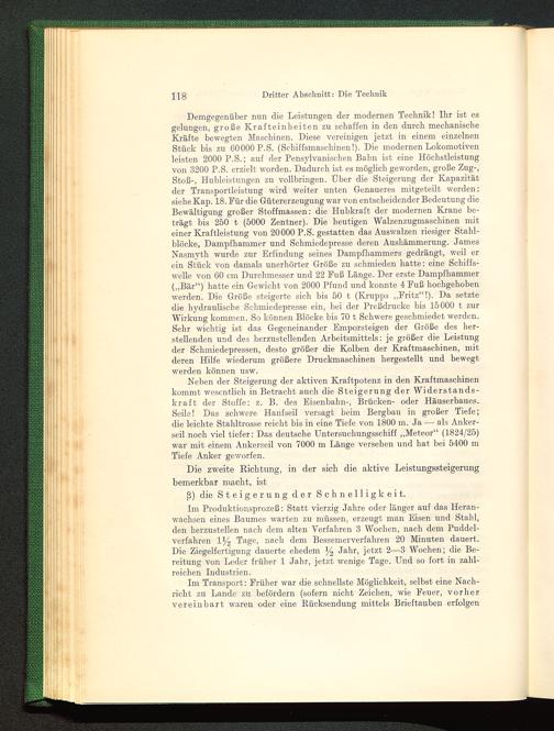 Demgegenüber nun die Leistungen der modernen Technik! Ihr ist esgelungen, große Krafteinheiten zu schaffen in den durch mechanischeKräfte bewegten Maschinen. Diese vereinigen jetzt in einem einzelnenStück bis zu 60000 P.S. (Schiffsmaschinen!). Die modernen Lokomotivenleisten 2000 P.S.; auf der Pensylvanischen Bahn ist eine Höchstleistungvon 3200 P.S. erzielt worden. Dadurch ist es möglich geworden, große Zug-,Stoß-, Hubleistungen zu vollbringen. Über die Steigerung der Kapazitätder Transportleistung wird weiter unten Genaueres mitgeteilt werden:siehe Kap. 18. Für die Gütererzeugung war von entscheidender Bedeutung dieBewältigung großer Stoffmassen: die Hubkraft der modernen Krane be-trägt bis 250 t (5000 Zentner). Die heutigen Walzenzugmaschinen miteiner Kraftleistung von 20000 P.S. gestatten das Auswalzen riesiger Stahl-blöcke, Dampfhammer und Schmiedepresse deren Aushämmerung. JamesNasmvth wurde zur Erfindung seines Dampfhammers gedrängt, weil erein Stück von damals unerhörter Größe zu schmieden hatte: eine Schiffs-welle von 60 cm Durchmesser und 22 Fuß Länge. Der erste Dampfhammer(„Bär“ ) hatte ein Gewicht von 2000 Pfund und konnte 4 Fuß hochgehobenwerden. Die Größe steigerte sich bis 50 t (Krupps „Fritz“!). Da setztedie hydraulische Schmiedepresse ein, bei der Preßdrucke bis 15000 t zurWirkung kommen. So können Blöcke bis 70 t Schwere geschmiedet werden.Sehr wichtig ist das Gegeneinander Emporsteigen der Größe des her-stellenden und des herzustellenden Arbeitsmittels: je größer die Leistungder Schmiedepressen, desto größer die Kolben der Kraftmaschinen, mitderen Hilfe wiederum größere Druckmaschinen hergestellt und bewegtwerden können usw.