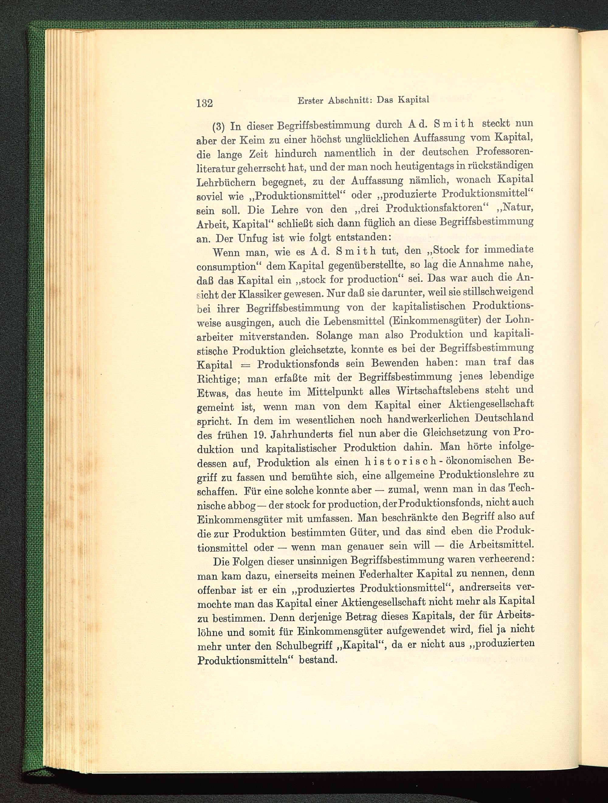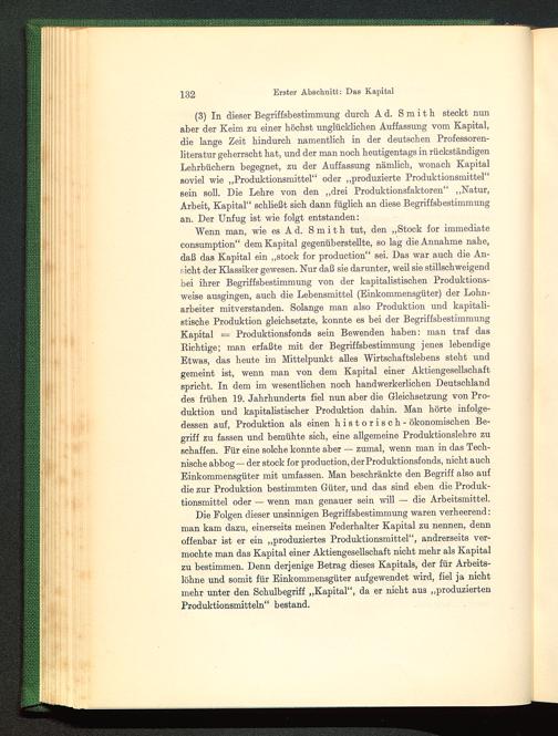 (3) In dieser Begriffsbestimmung durch Ad. Smith steckt nunaber der Keim zu einer höchst unglücklichen Auffassung vom Kapital,die lange Zeit hindurch namentlich in der deutschen Professoren-literatur geherrscht hat, und der man noch heutigentags in rückständigenLehrbüchern begegnet, zu der Auffassung nämlich, wonach Kapitalsoviel wie „Produktionsmittel“ oder „produzierte Produktionsmittel“sein soll. Die Lehre von den „drei Produktionsfaktoren“ „Natur,Arbeit, Kapital“ schließt sich dann füglich an diese Begriffsbestimmungan. Der Unfug ist wie folgt entstanden: