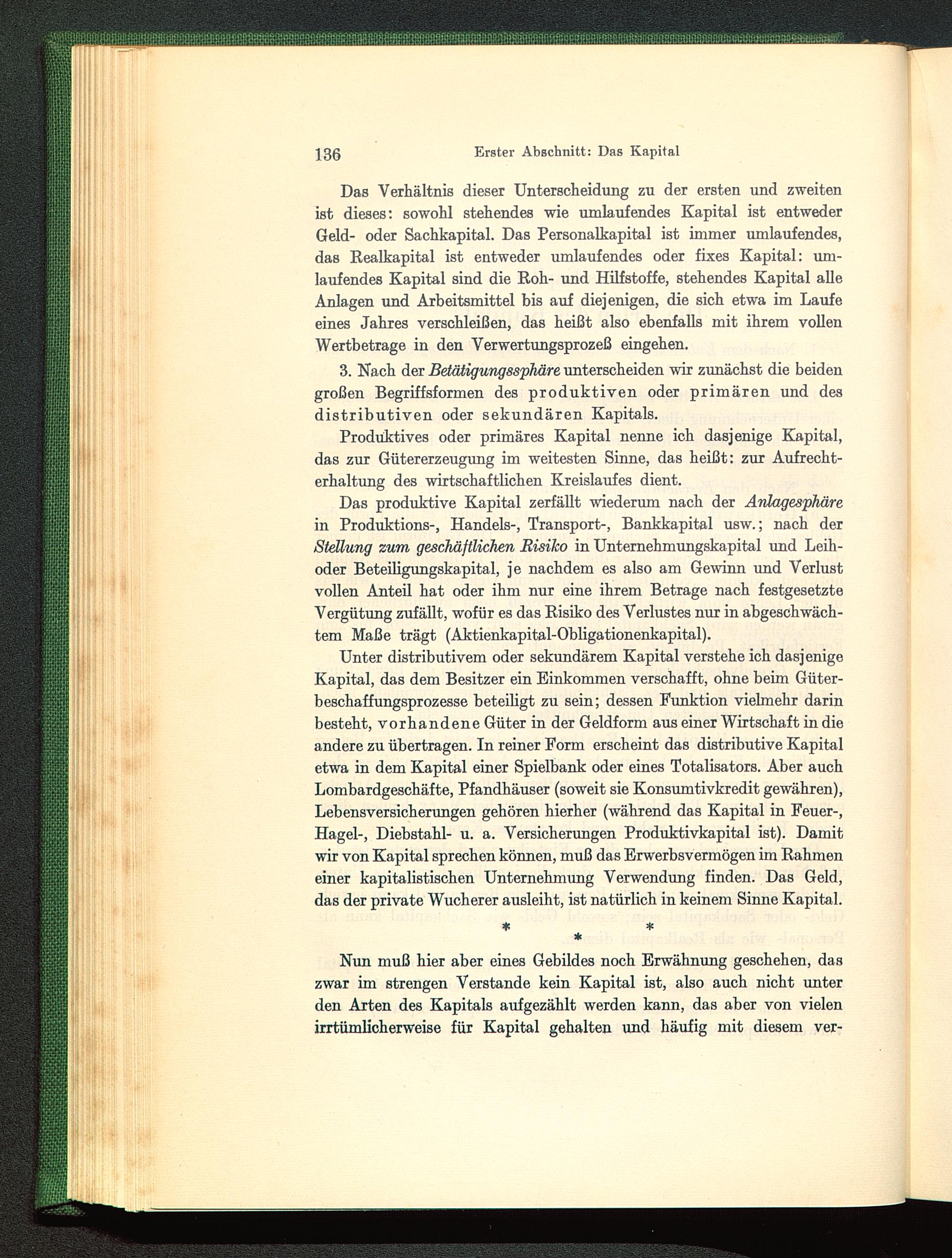 Produktives oder primäres Kapital nenne ich dasjenige Kapital,das zur Gütererzeugung im weitesten Sinne, das heißt: zur Aufrecht-erhaltung des wirtschaftlichen Kreislaufes dient.