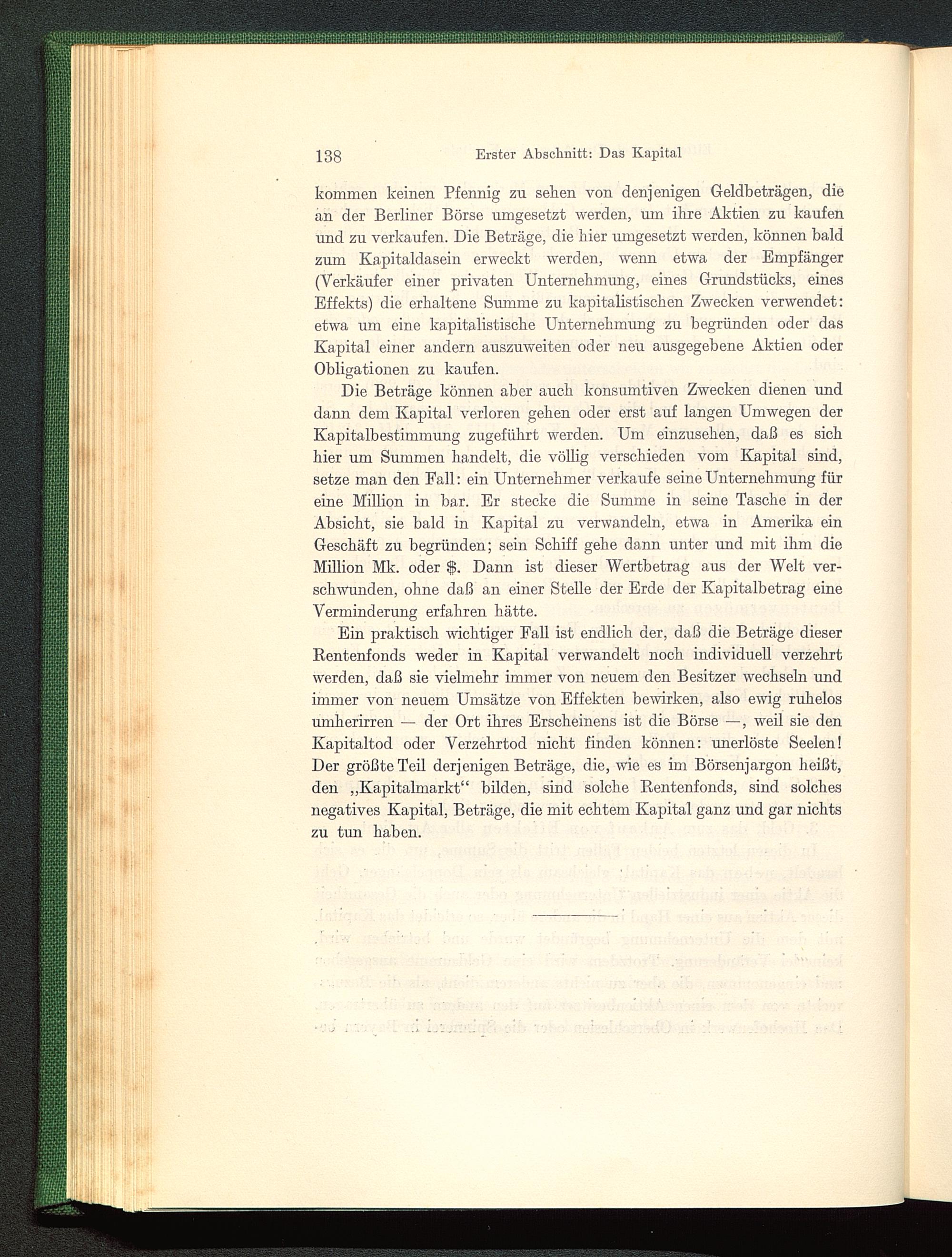 Ein praktisch wichtiger Fall ist endlich der, daß die Beträge dieserRentenfonds weder in Kapital verwandelt noch individuell verzehrtwerden, daß sie vielmehr immer von neuem den Besitzer wechseln undimmer von neuem Umsätze von Effekten bewirken, also ewig ruhelosumherirren — der Ort ihres Erscheinens ist die Börse —, weil sie denKapitaltod oder Verzehrtod nicht finden können: imerlöste Seelen!Der größte Teil derjenigen Beträge, die, wie es im Börsenjargon heißt,den „Kapitalmarkt“ bilden, sind solche Rentenfonds, sind solchesnegatives Kapital, Beträge, die mit echtem Kapital ganz und gar nichtszu tun haben.