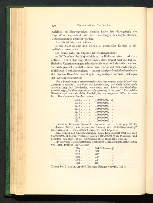 Nach Berechnungen amerikanischer Forscher werden neun Zehntel des„corporate surplus“, das heißt des Reinertrages, der übrig bleibt nachAusschüttung der Dividenden, verwendet zum Zweck der Geschäfts-erweiterung („for the extension or safe guarding of business“). Um welcheRiesenbeträge es sich dabei handelt, ist aus folgenden Ziffern ersicht-lich: Der Corporate Surplus betrug:
